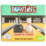 Three piece salt and pepper set shaped to look like a bowling ball, pin and alley.