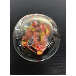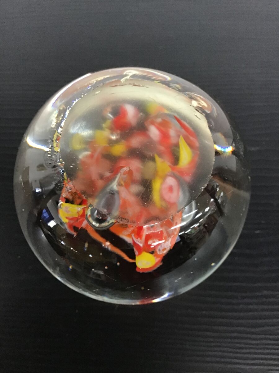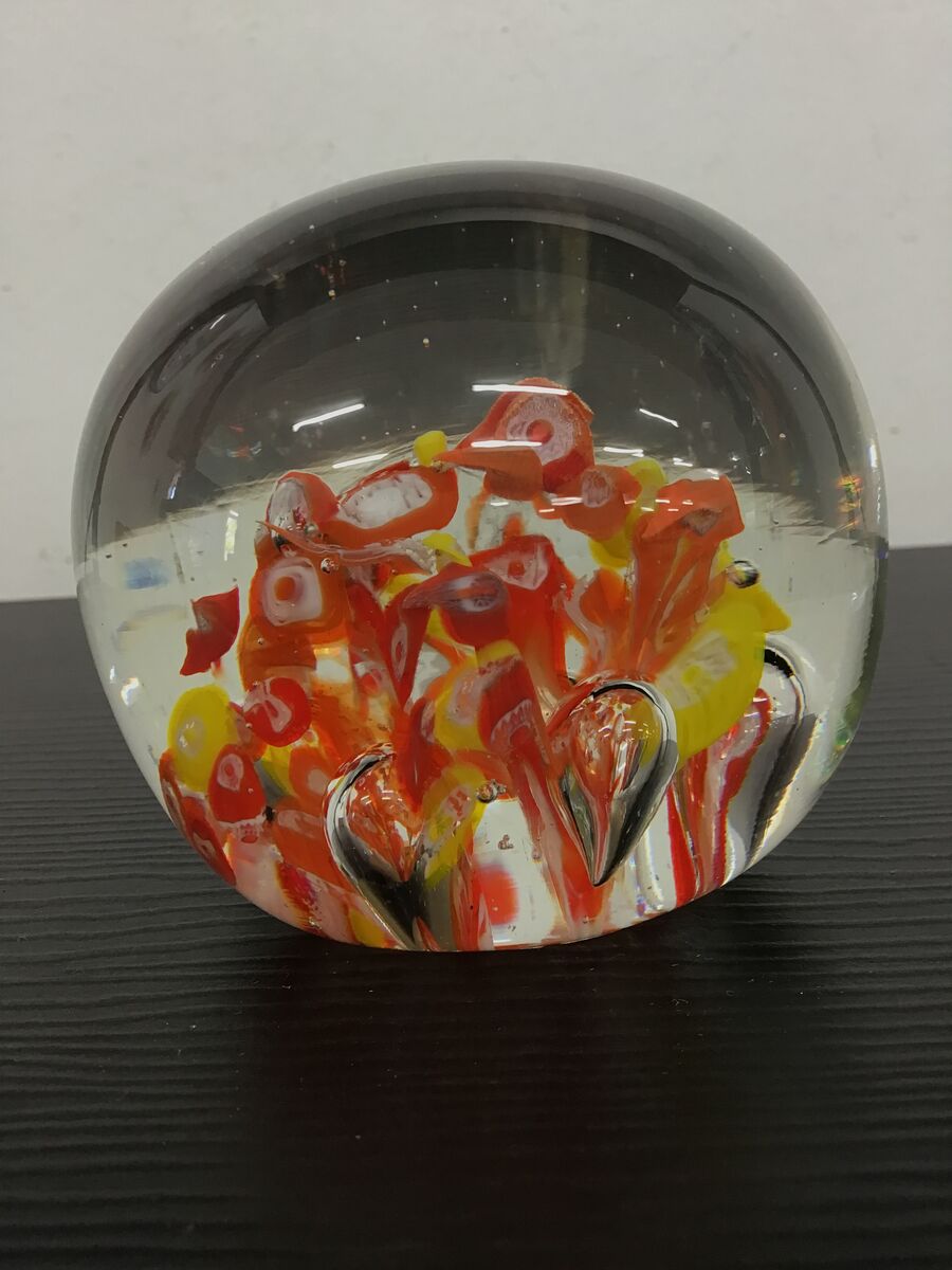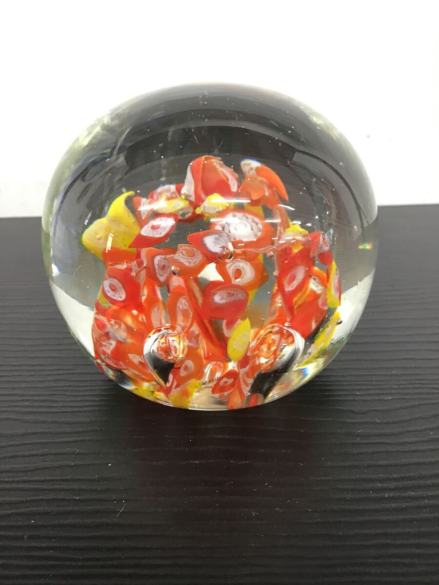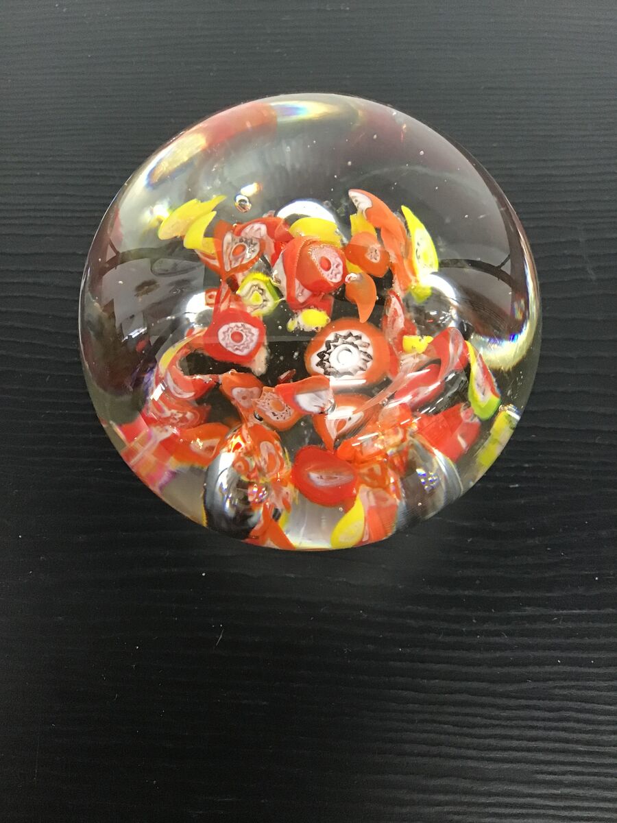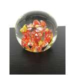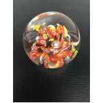 Round art glass paperweight with orange, yellow and white millefiori at its center. Unsigned, maker unknown.