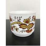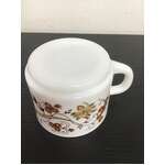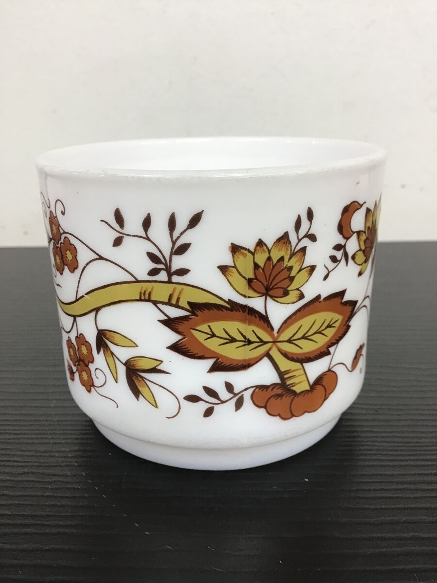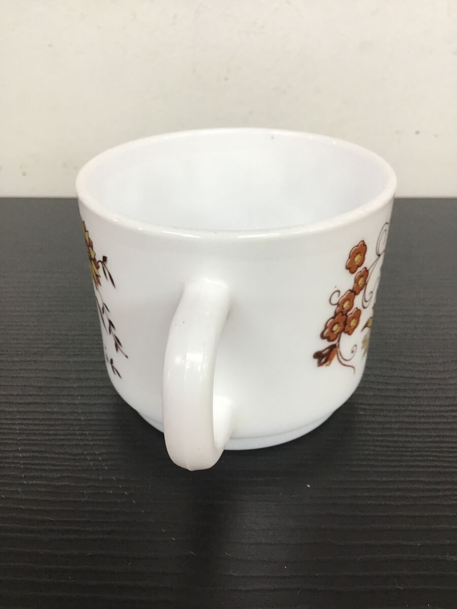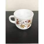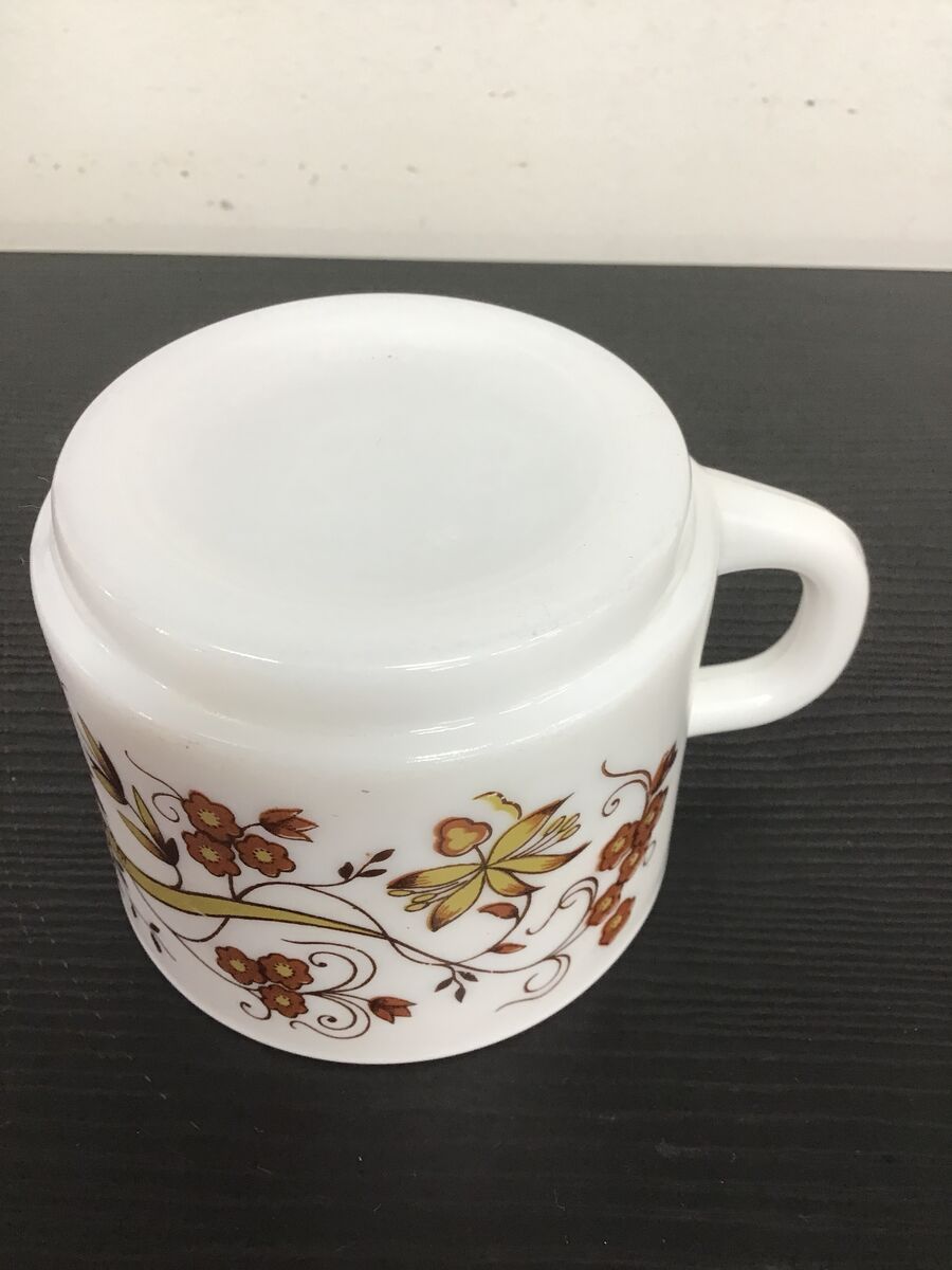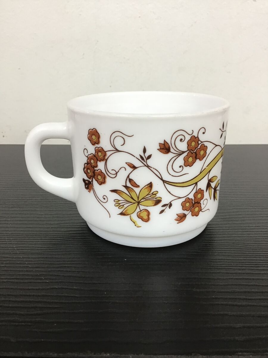 Retro milk glass cup made by Arcopal France, 'Brown Onion' floral pattern.