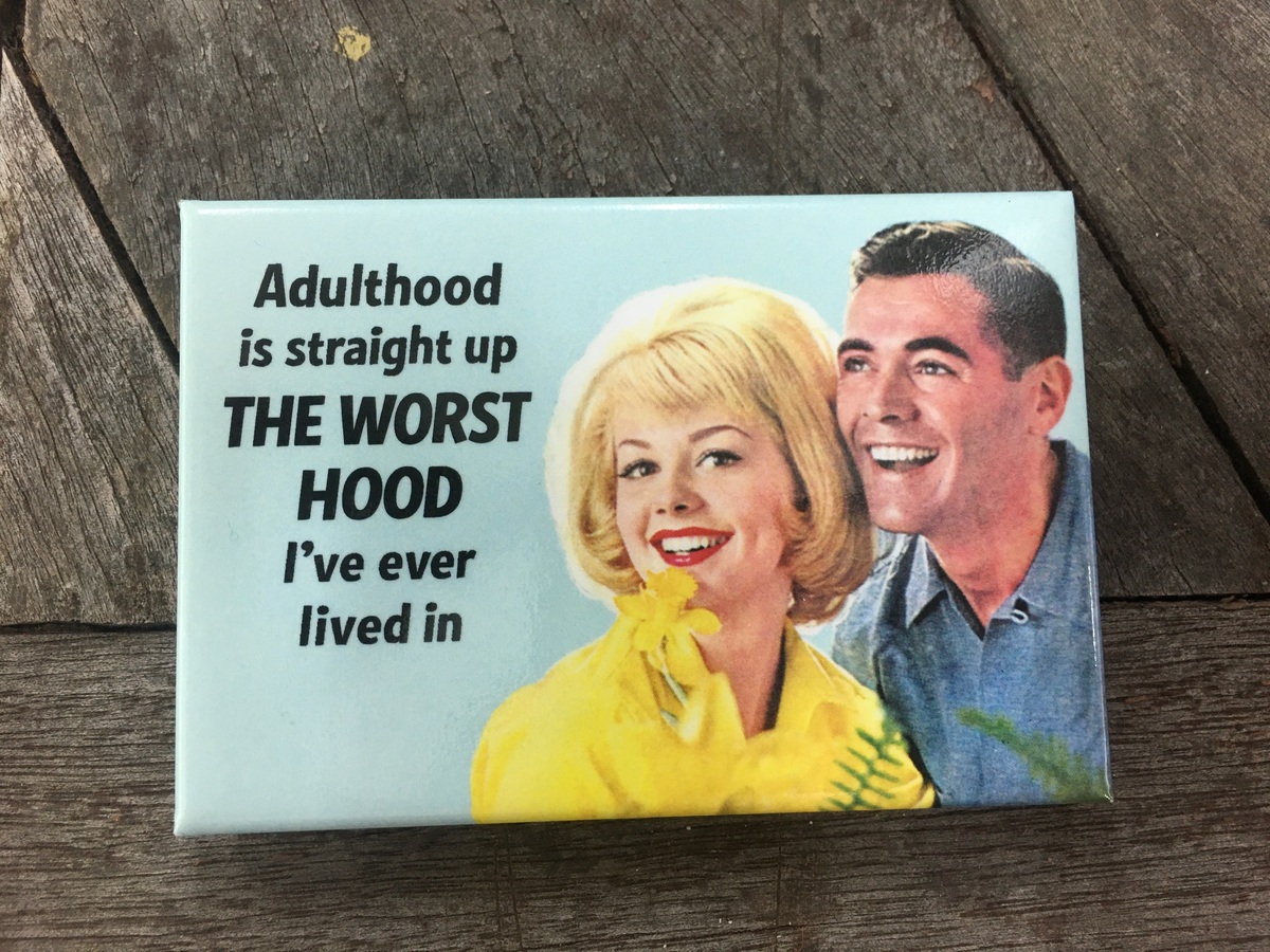 "Adulthood is straight up the worst hood I've every lived in" Retro styled magnet, made in the USA. Nice quality, not flimsy - will hold multiple unpaid bills to your fridge.