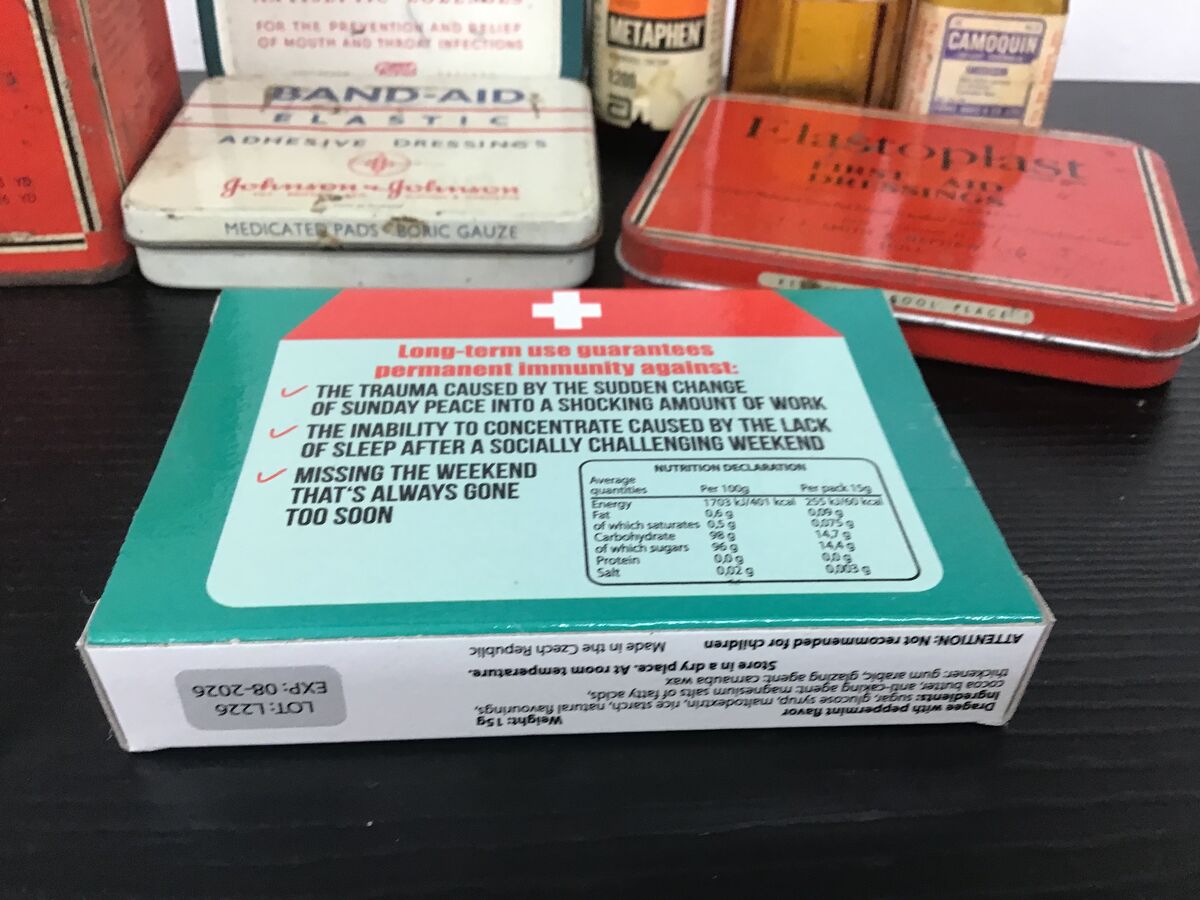 - Novelty “Sweet First Aid” peppermint mints in a faux blister pack