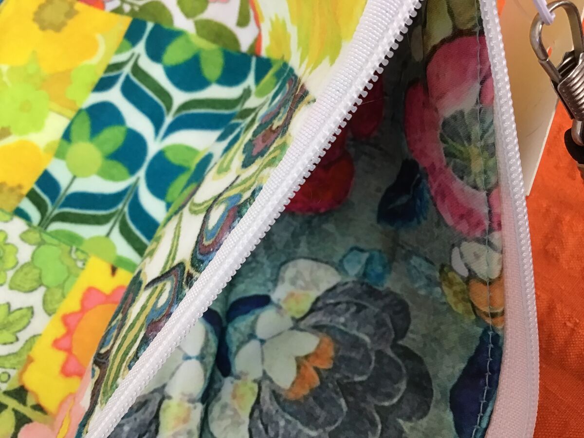It has a zipper closure, colourful lining and detachable writst strap.