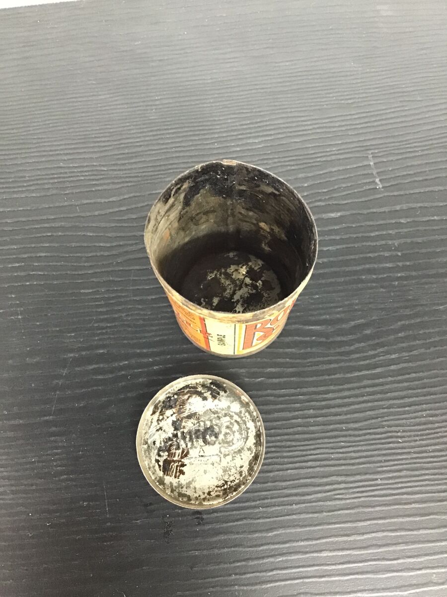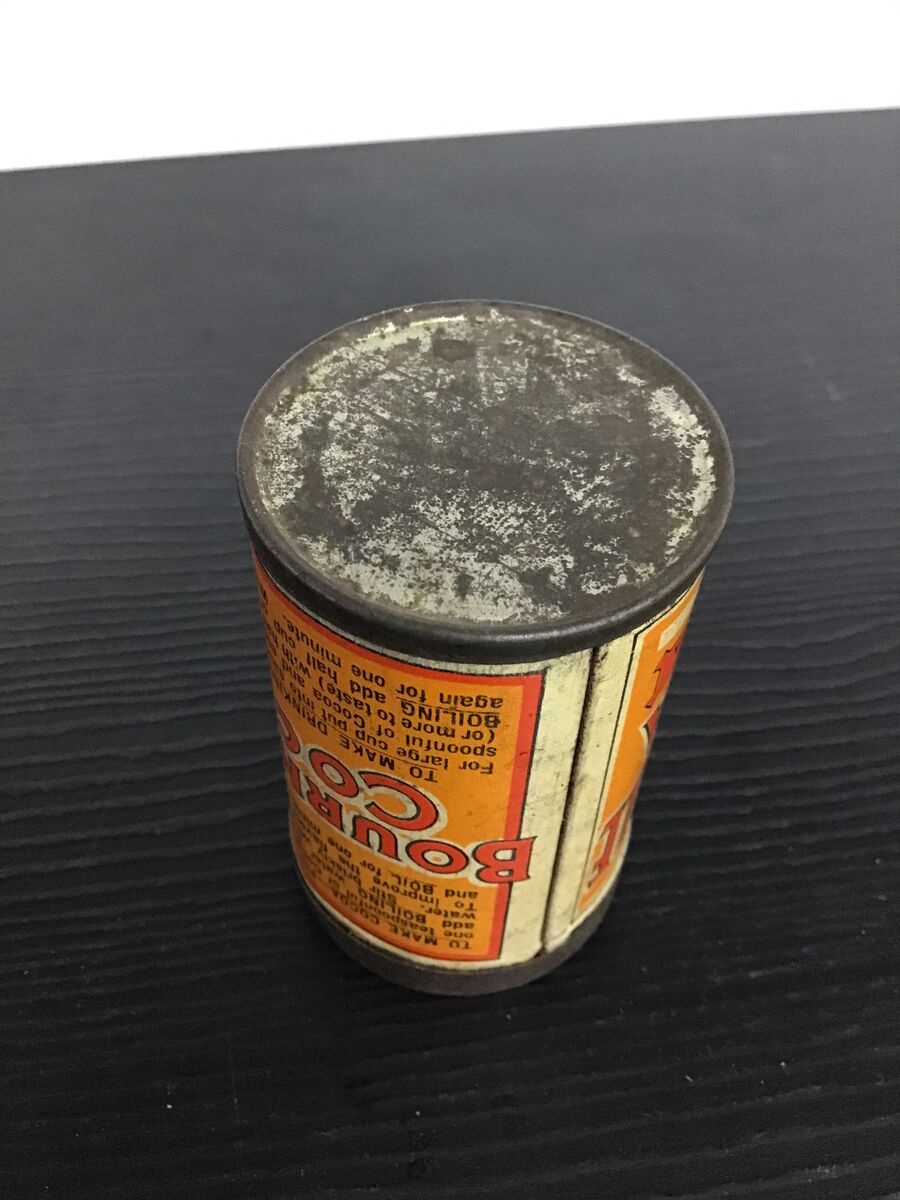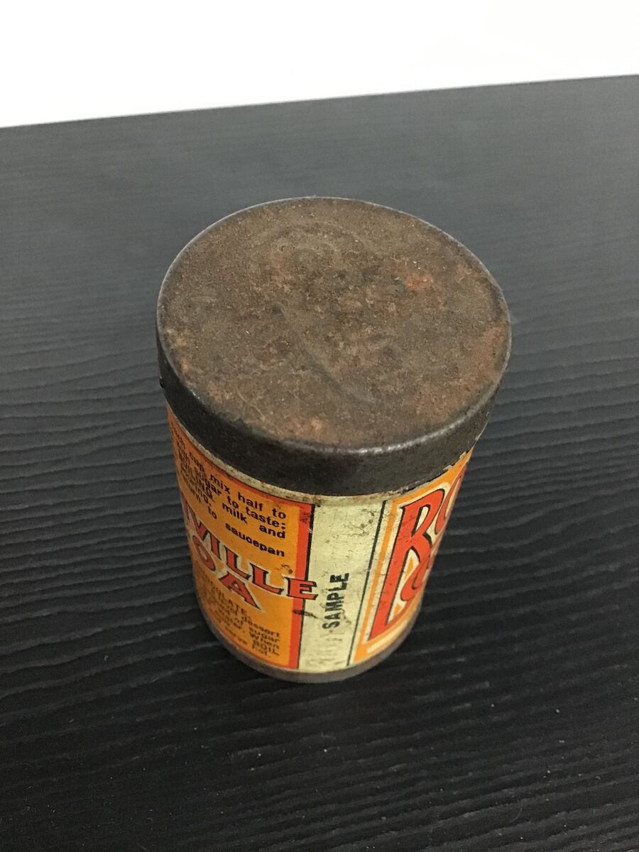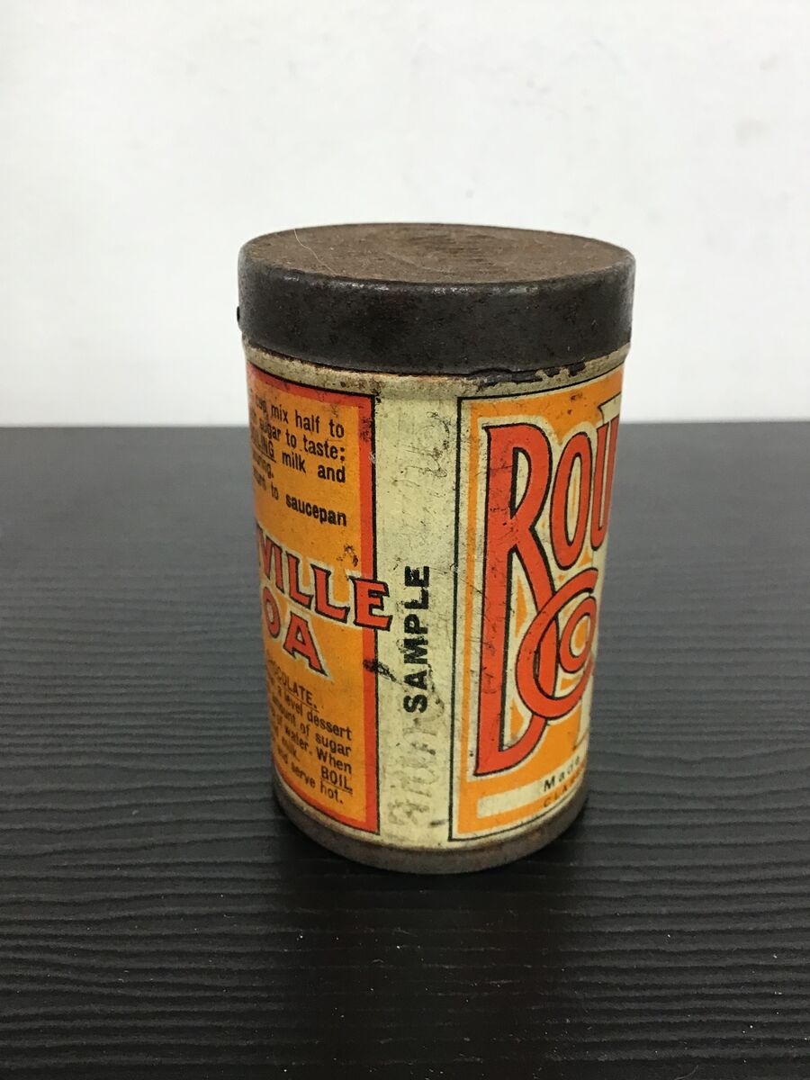 Antique lithographed Bournville Cocoa tin - miniature size with a cylinder shape.