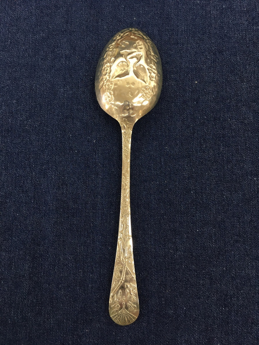 ANTIQUE Repousse Serving Spoon with Storks Oriental Theme - Victorian Design Lozenge C1880