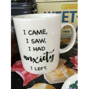 'I came, I saw, I had anxiety, I left'. Story of my life in mug form...wish I could take it to parties....