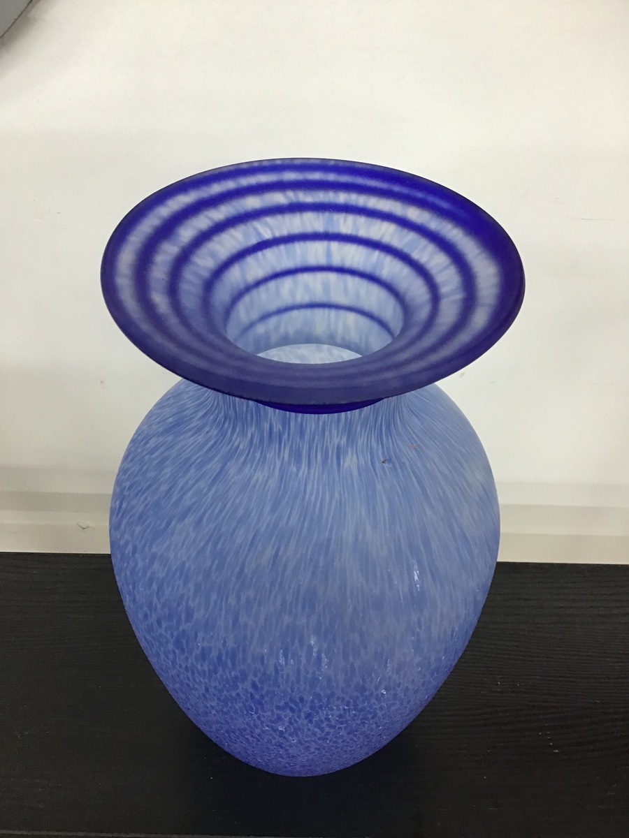 Vintage art glass vase - made from a lovely speckled blue glass with an applied swirl applied around the rim. A good size, standing 25 cm tall.