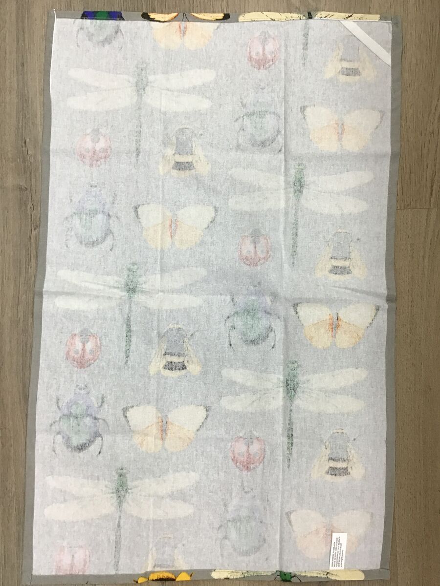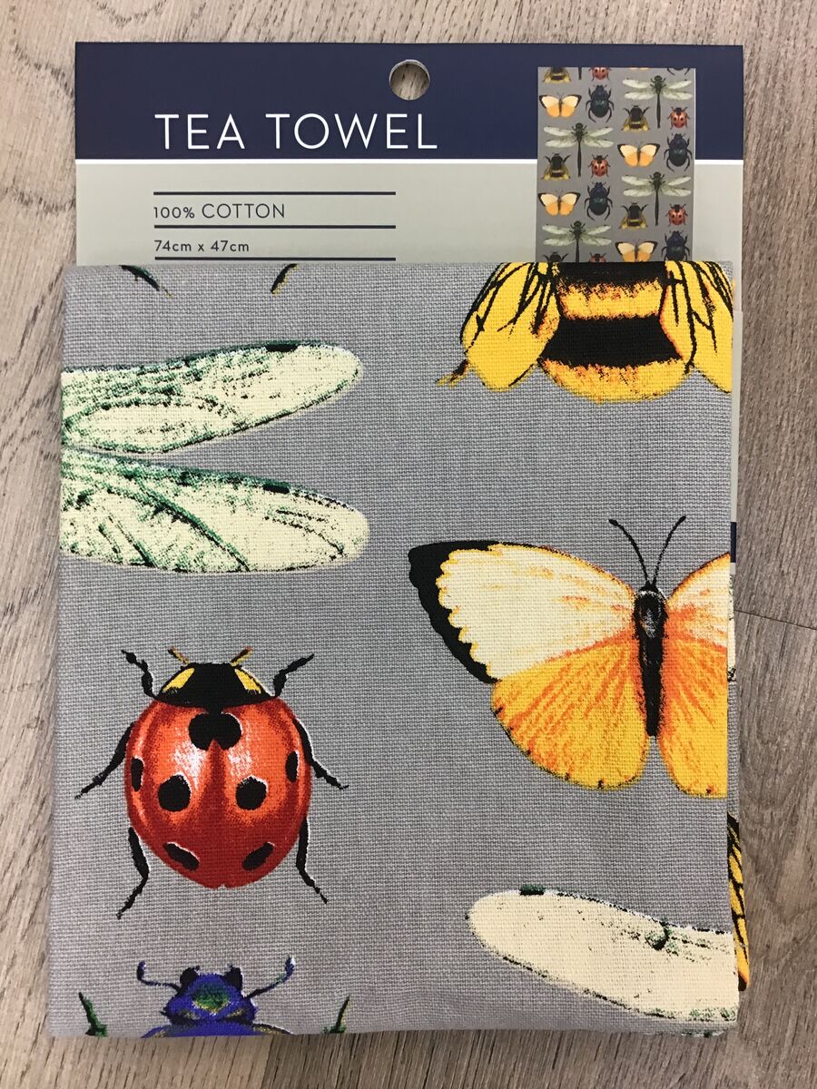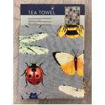 This teatowel features a delightful parade of insects and butterflies in neat, repeating rows. Ladybirds, dragonflies, beetles, bees, and butterflies pop against a soft grey background, making it ideal for nature lovers and quirky gift-givers alike.