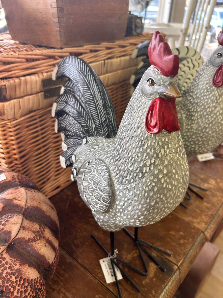 Grey rooster ornament for indoor/outdoor use (made from resin).