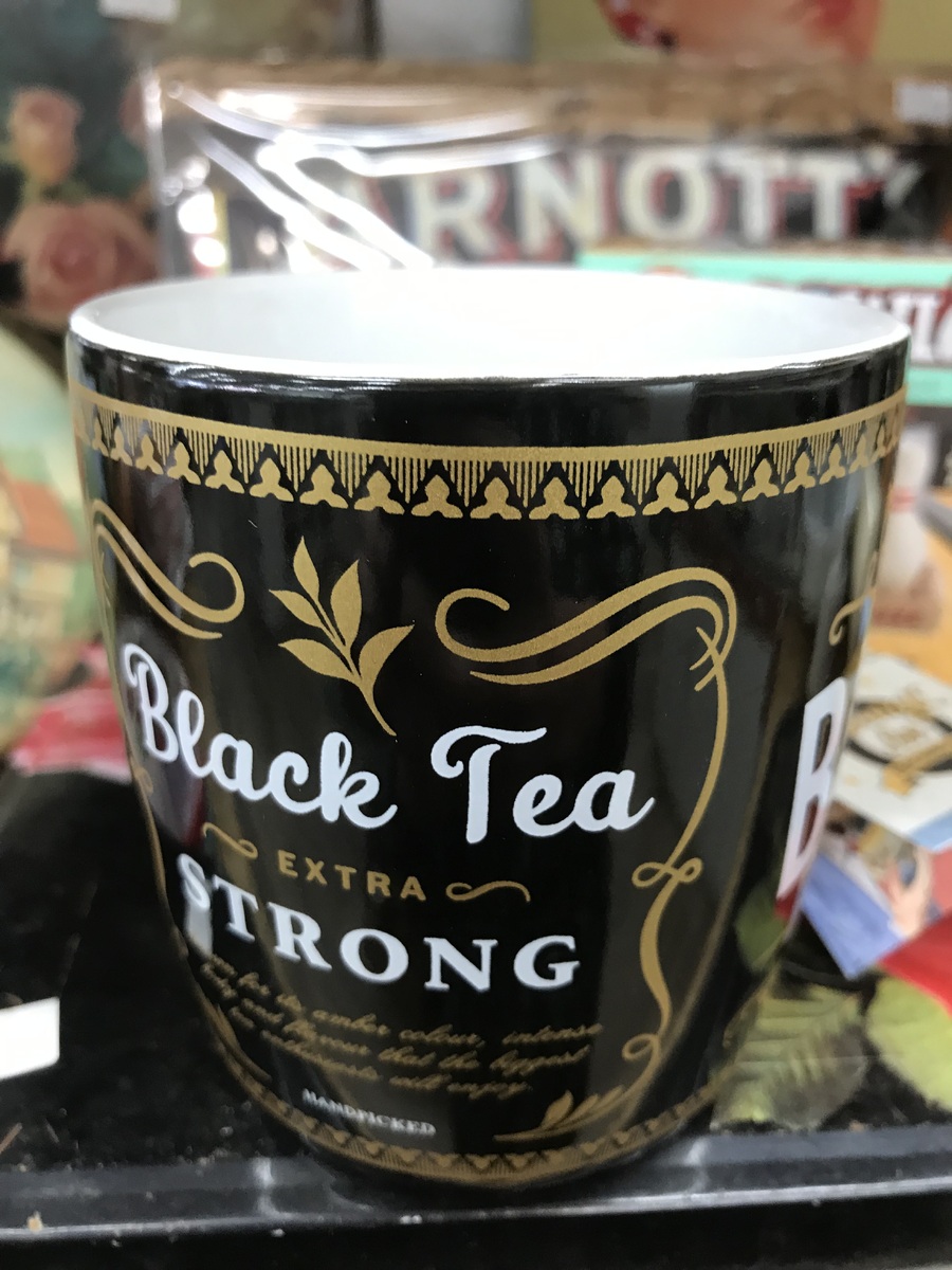Generous sized and sturdy mug - made by German brand Nostalgic Art. Labelled for 'Black Tea'. Classic black, gold and white colours and old school graphics. Excellent quality!