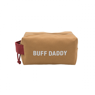 Beige body with maroon handle and inner (which is waterproof). White lettering on the side, 'Buff Daddy'.