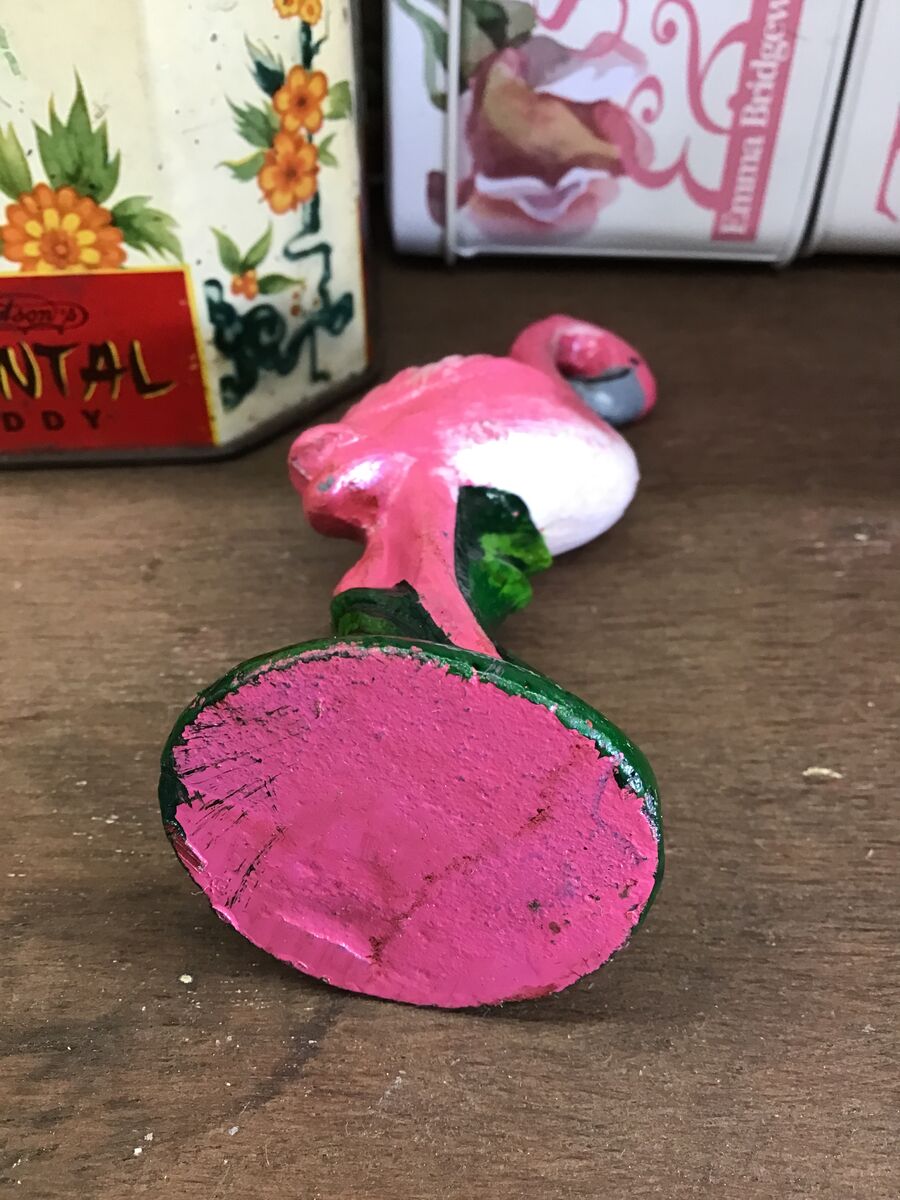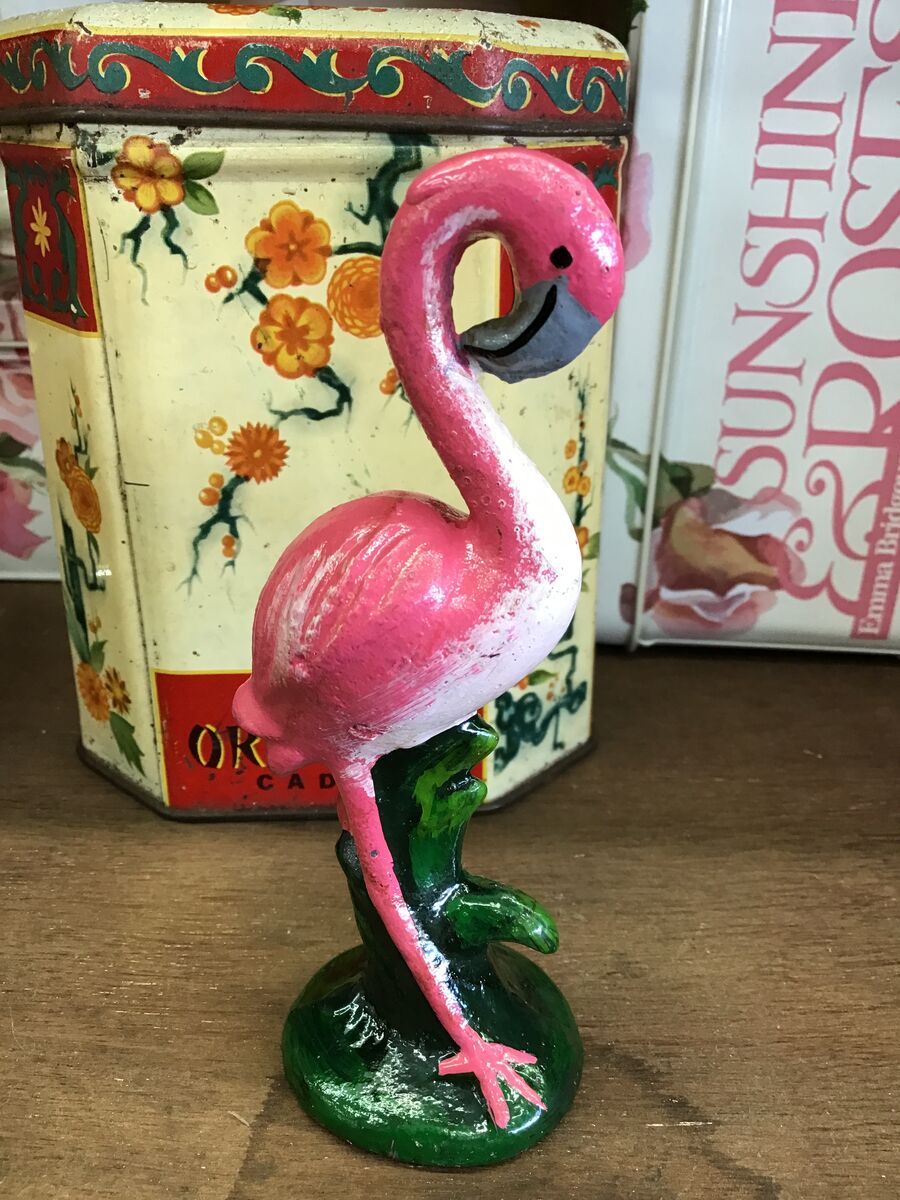 Cast iron flamingo bottle opener. Standing design so doubles up as a pretty ornament, the opener is disguised as one of the leaves near the base.