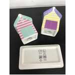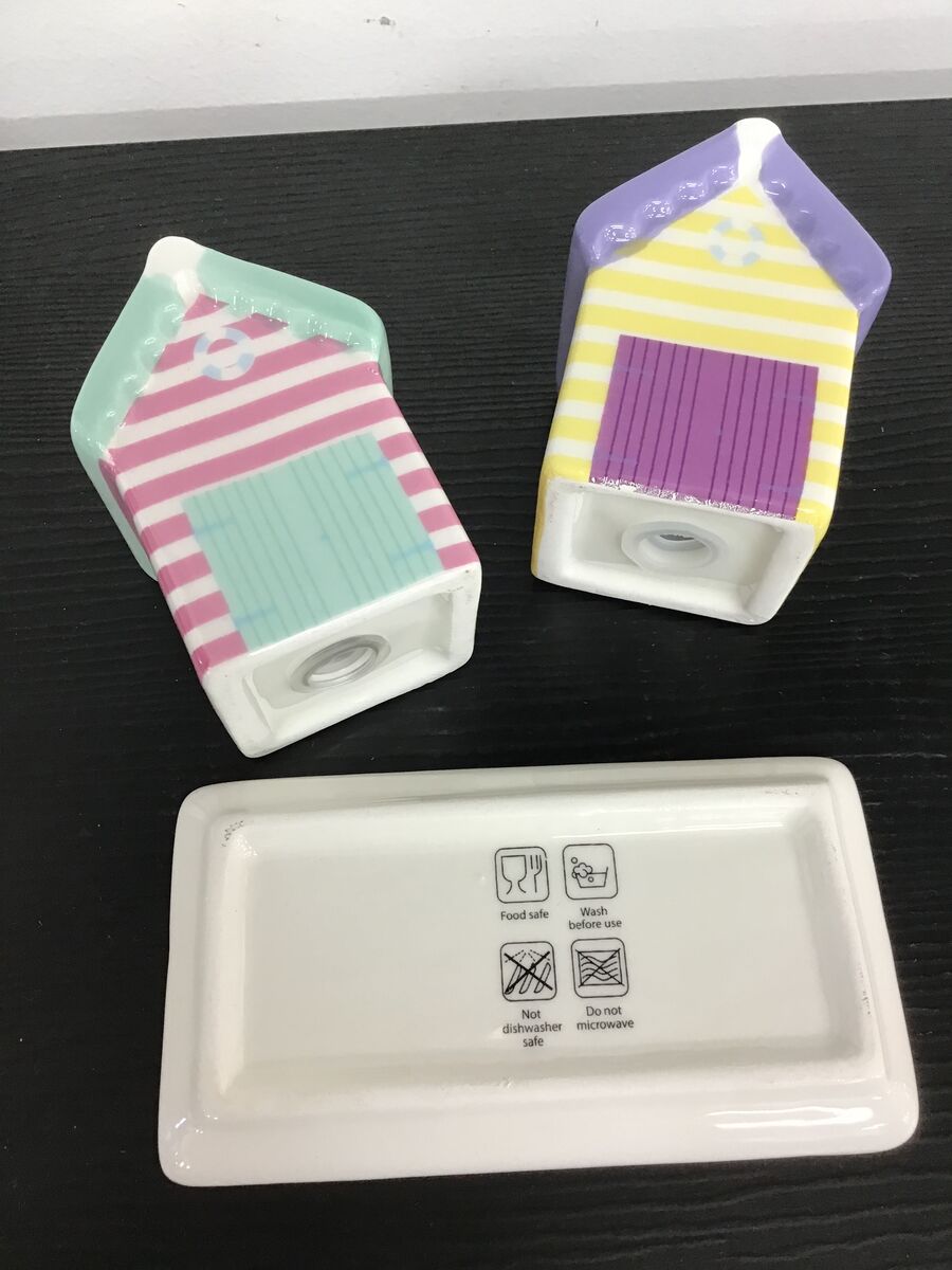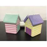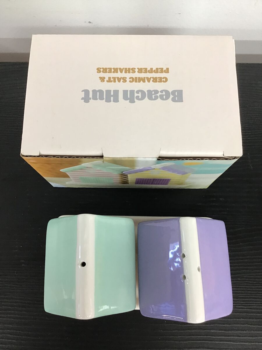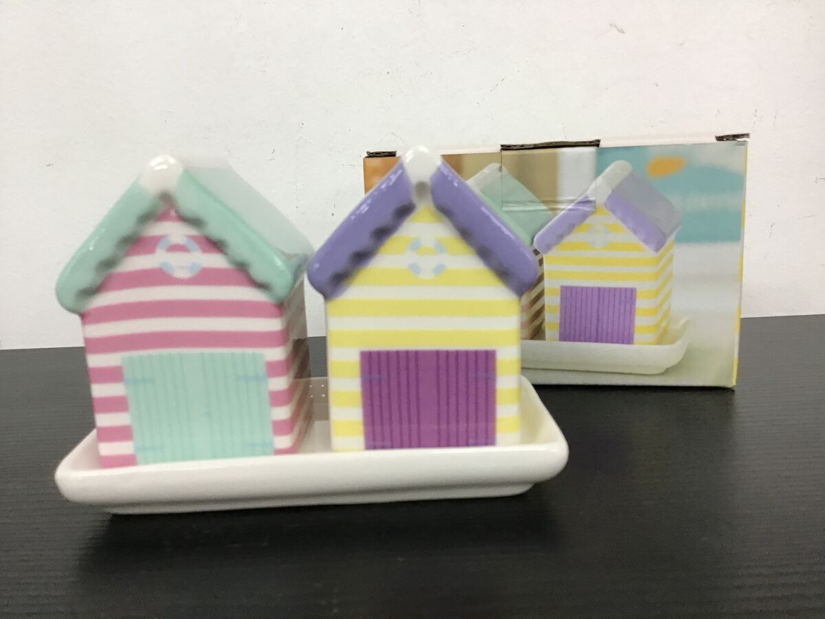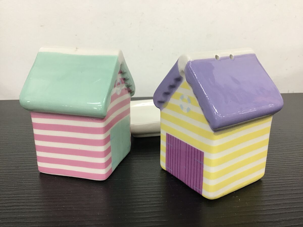 Cute and kitschy ceramic beach hut salt and pepper shakers.
