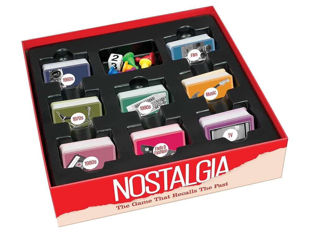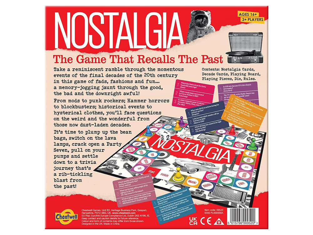 Nostalgia (by Cheatwell Games) is a classic trivia board game that takes you back through the big moments, fashions and fads of the late twentieth century. Players answer questions about the 1960s, 70s, 80s and 90s, plus categories like music, TV and film, and fads and fashion, all based on UK and mainstream pop culture.