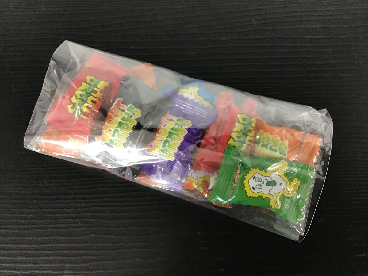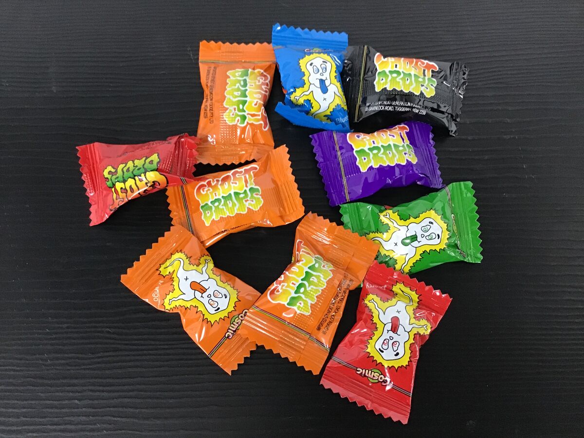 Cosmic Ghost Drops are hard fruit flavoured lollies that change your tongue to the colour of the lolly. Colours include orange, green, black, red and purple.
