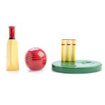 Cricket table salt and pepper set, consisting of a bat and ball shaker with a wicket stand.