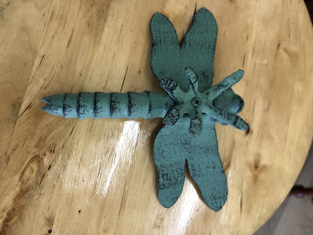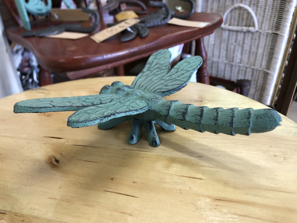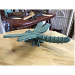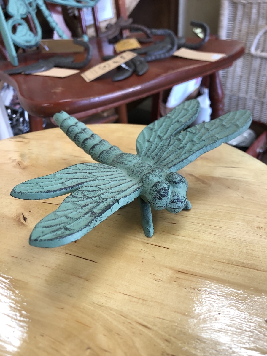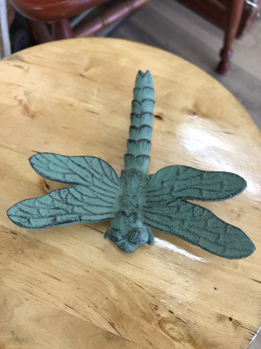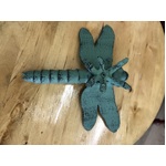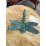 Cast iron dragonfly ornament in verdigris green.