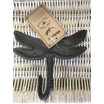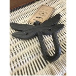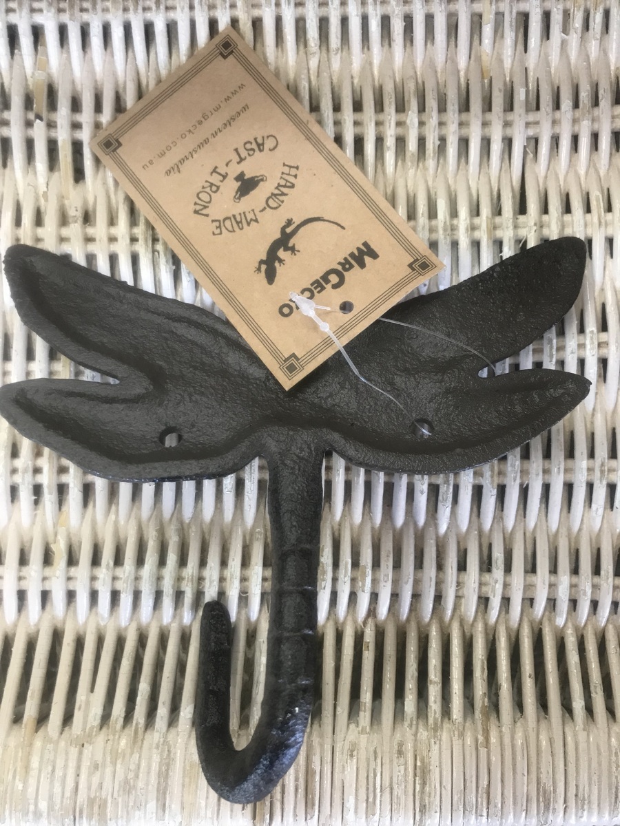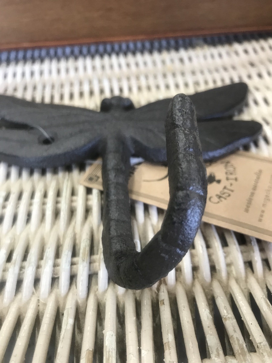 Cast iron hook, shaped to look like a dragonfly, with the tail curved up to act as the hook.