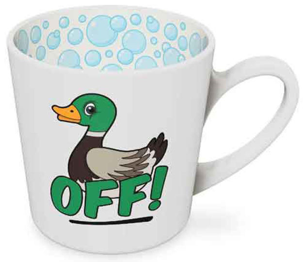 Ceramic mug with cute duck motif, the word 'off' and bubbles on the inside.