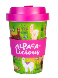 Drink on the go with this eco-friendly bamboo travel mug. Alpaca themed.