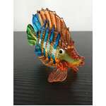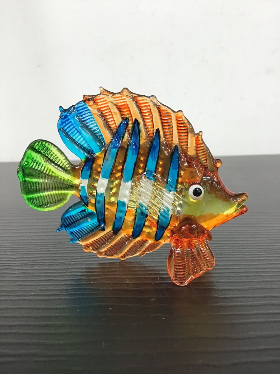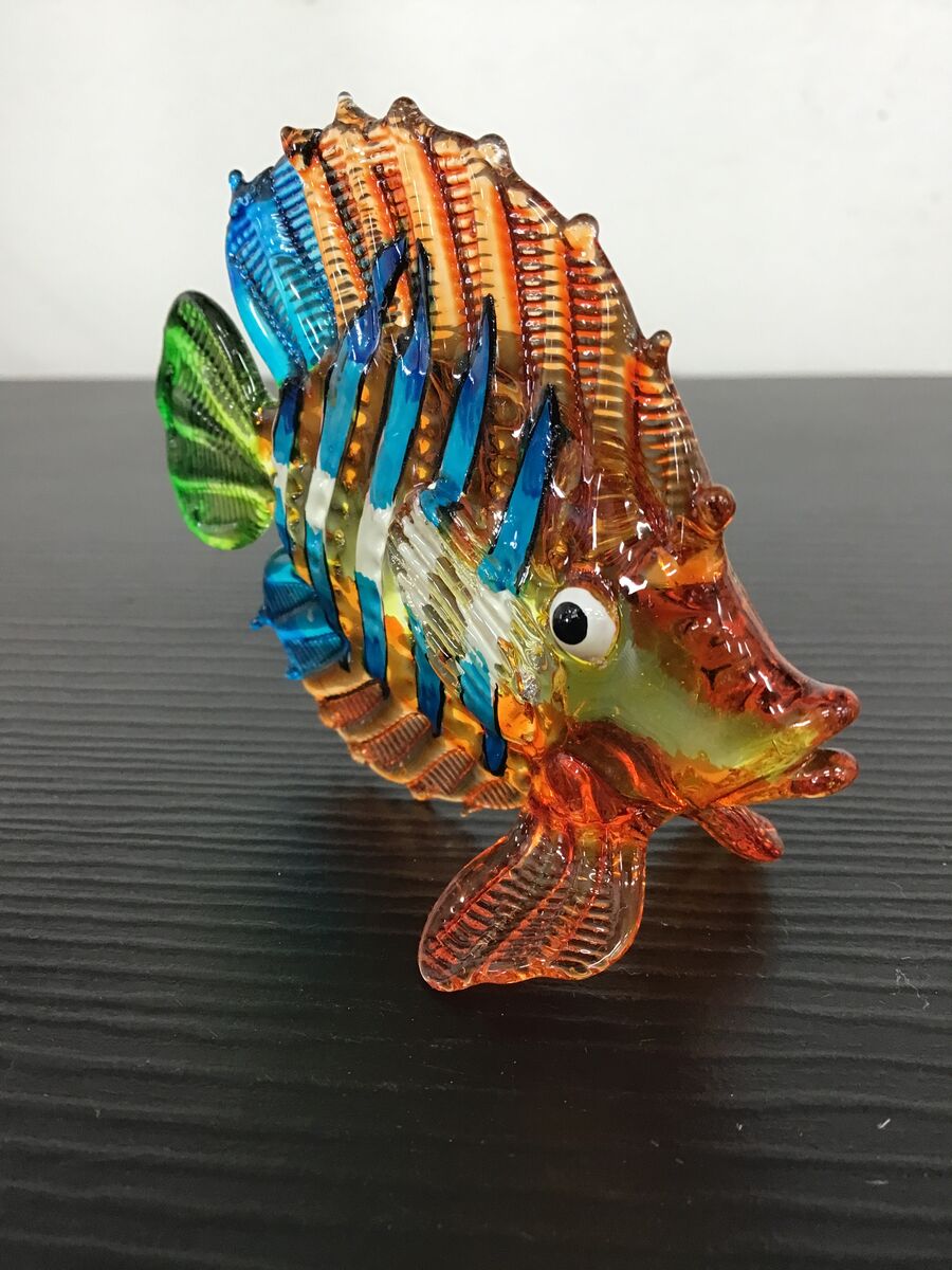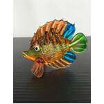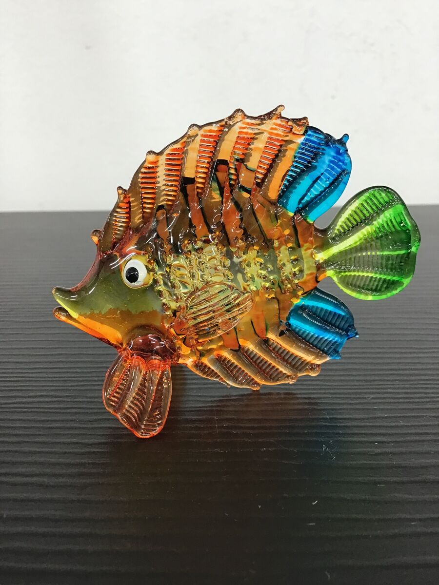 Stunning little hand blown glass fish - orange, blue and yellow glass body with hand painted blue metallic stripes laid over the top. Green tail fin. Catches the light beautifully.