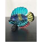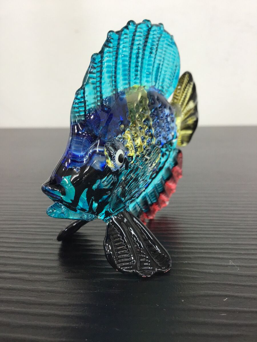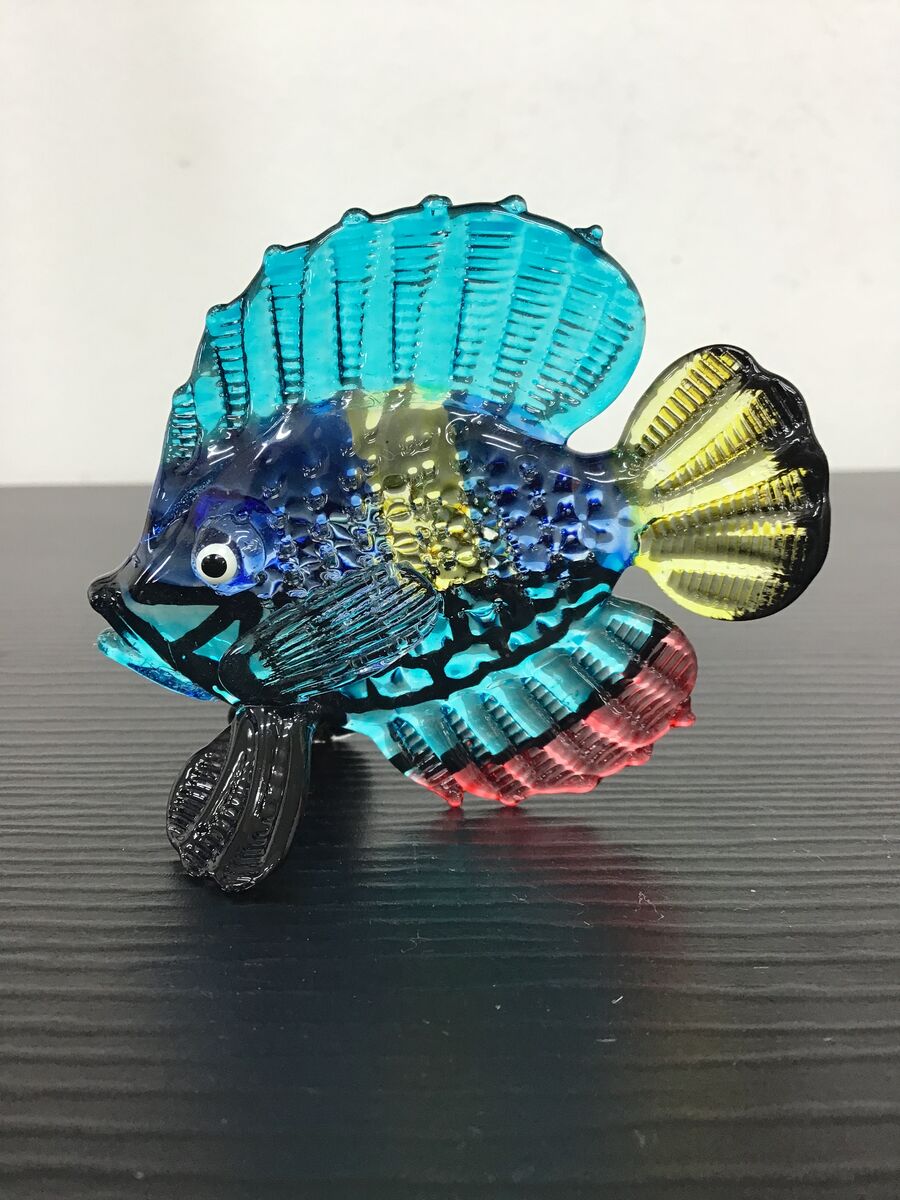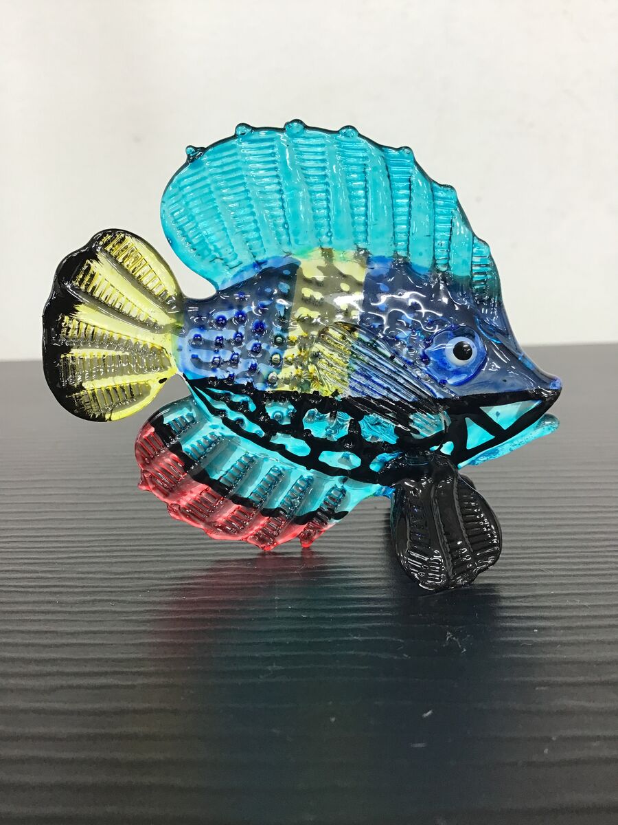 Hand blown glass fish in blue, yellow and pink with hand painted details.