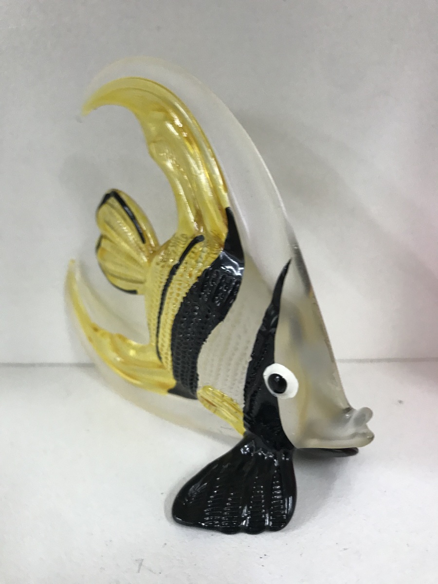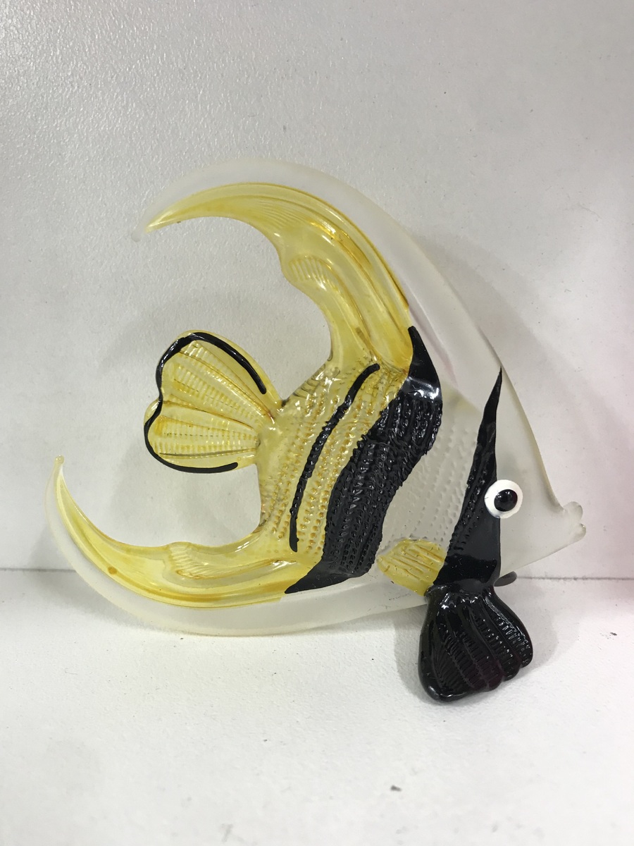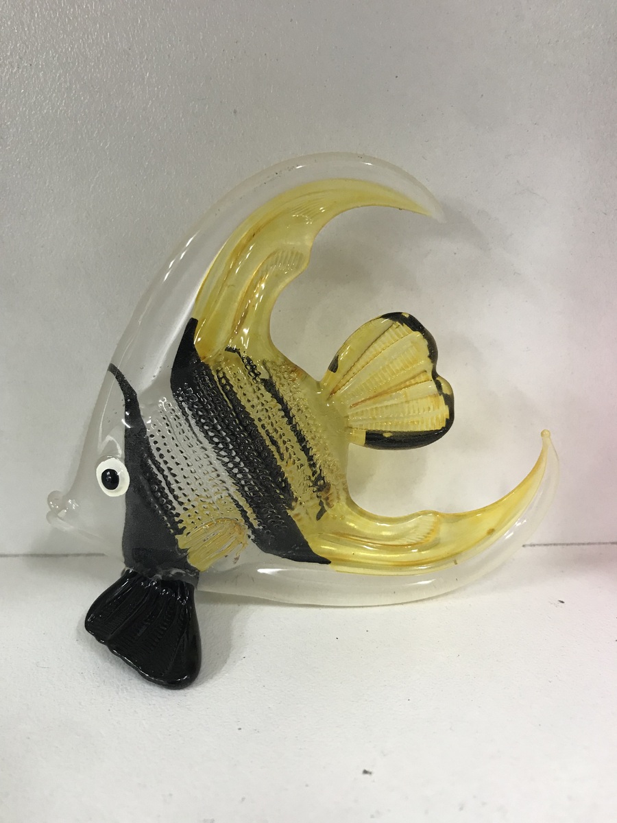 Hand blown glass fish - a Moorish Idol. Yellow with black stripes.