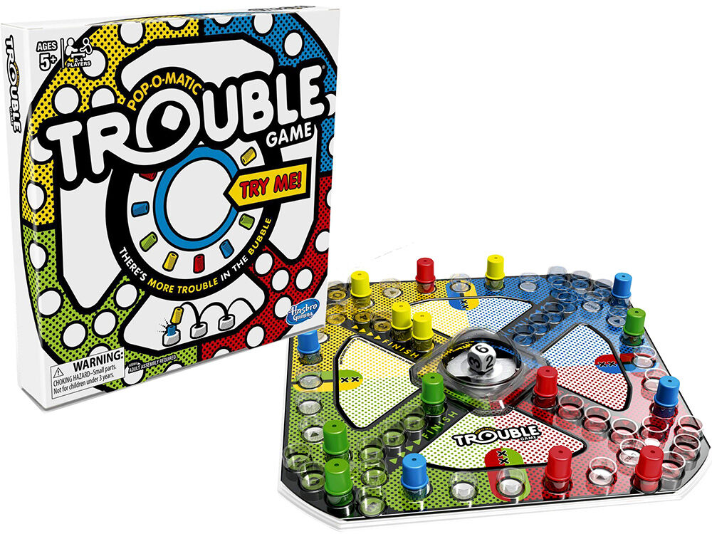 Hasbro Trouble is a fast-paced race-around-the-board game featuring the iconic Pop-O-Matic dice bubble. Players press the bubble to “pop” the die, then move their coloured pegs around the track and try to be the first to get all of their pieces home. The popping is good fun but it also means you can't lose the dice, a feature I wish every family board game came with!