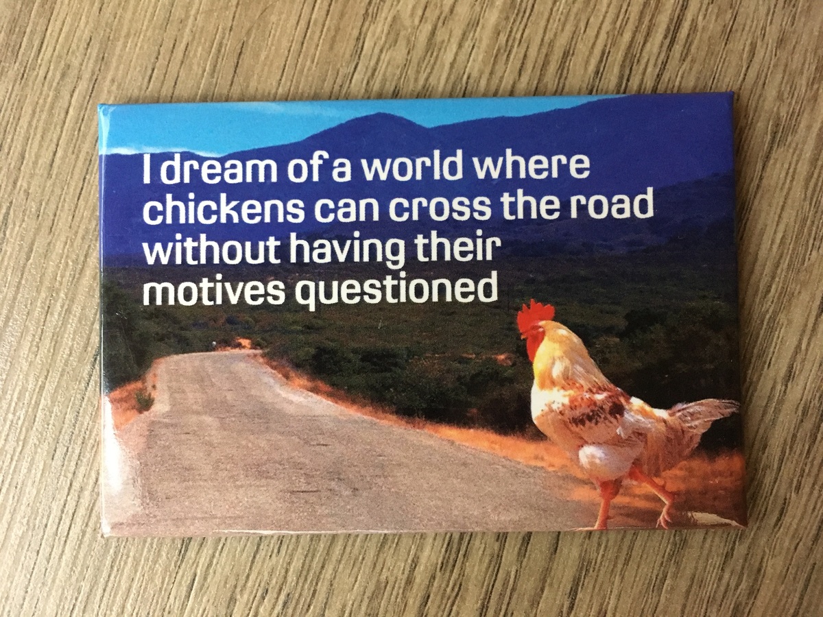 'I dream of a world where chickens can cross the road without having their motives questioned'. Fridge magnet.