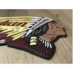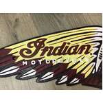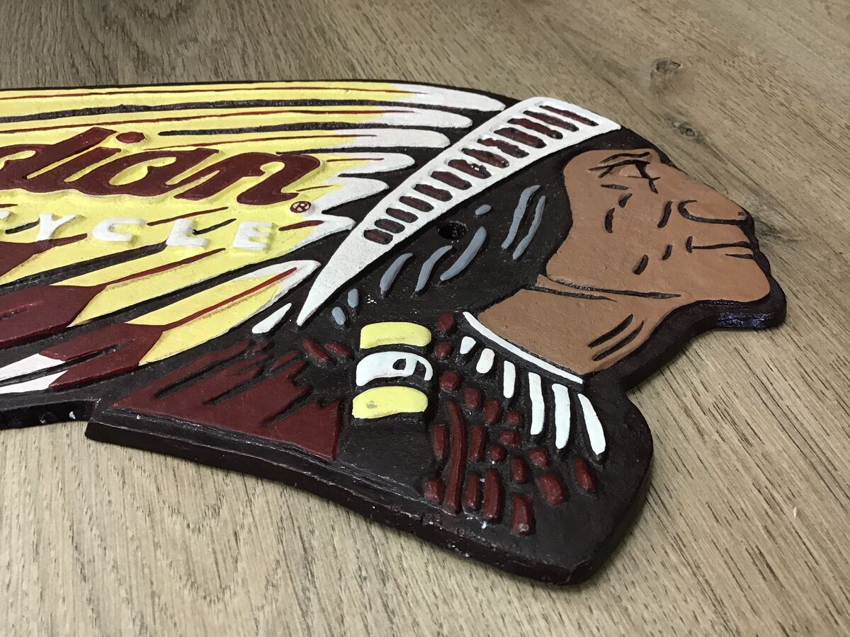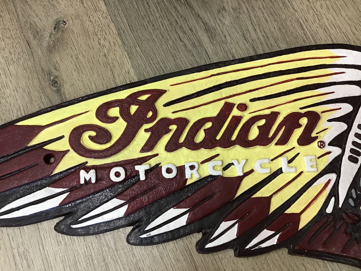 Large Indian Motorcycles cast iron sign featuring the classic Indian chief headdress logo. At around 60 cm across, it is big, bold and made to be the hero piece in any garage, bar, shed or man cave.