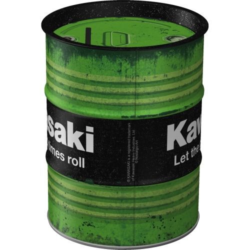 Rev up your savings with this Kawasaki oil barrel money box tin styled like a classic petrol drum.