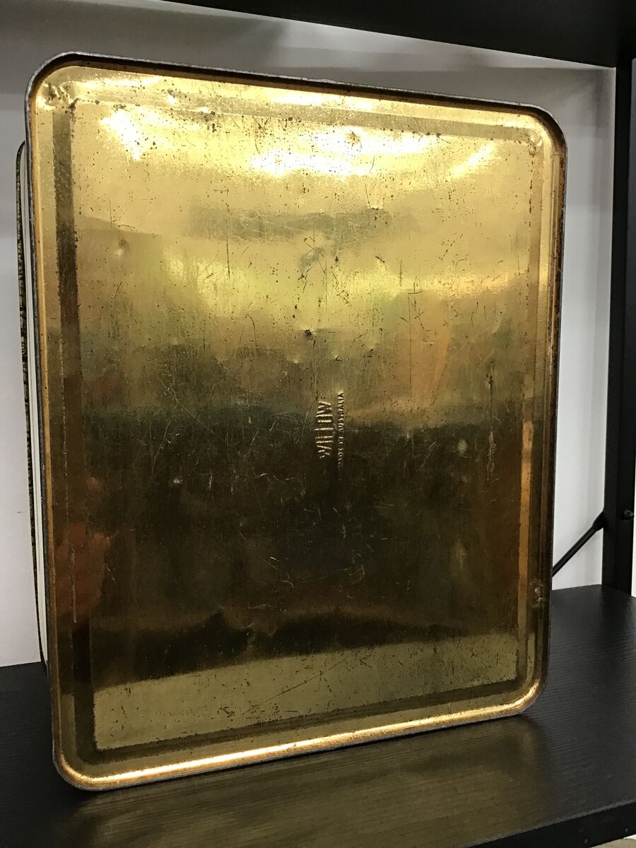 Old Willow Australia tin - large rectangular shape. Cream coloured base with a lid decorated with an image of a baby with teeth.