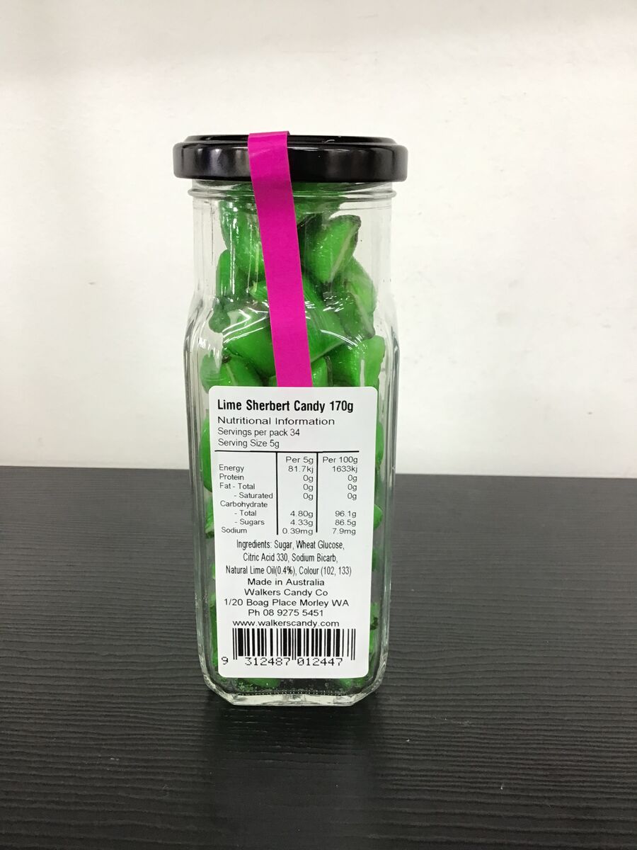 Sugar, wheat glucose, citric acid 330, sodium bicarbonate, natural lime oil and colour (102, 133)