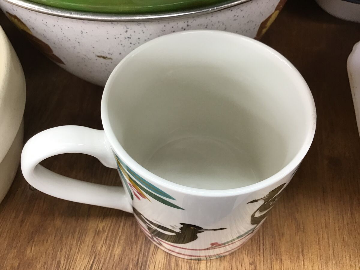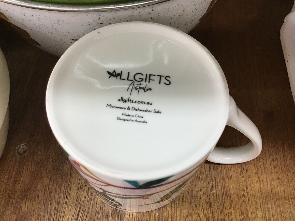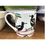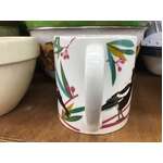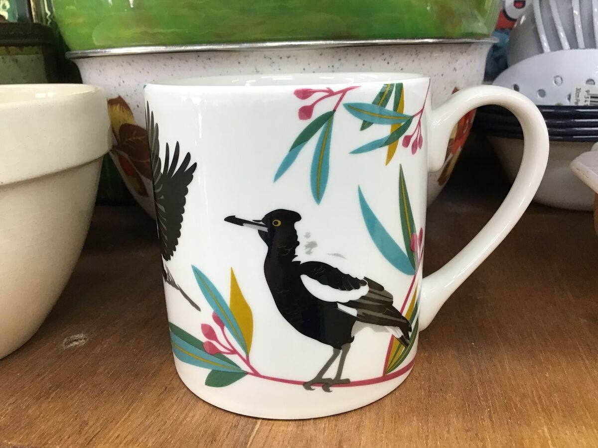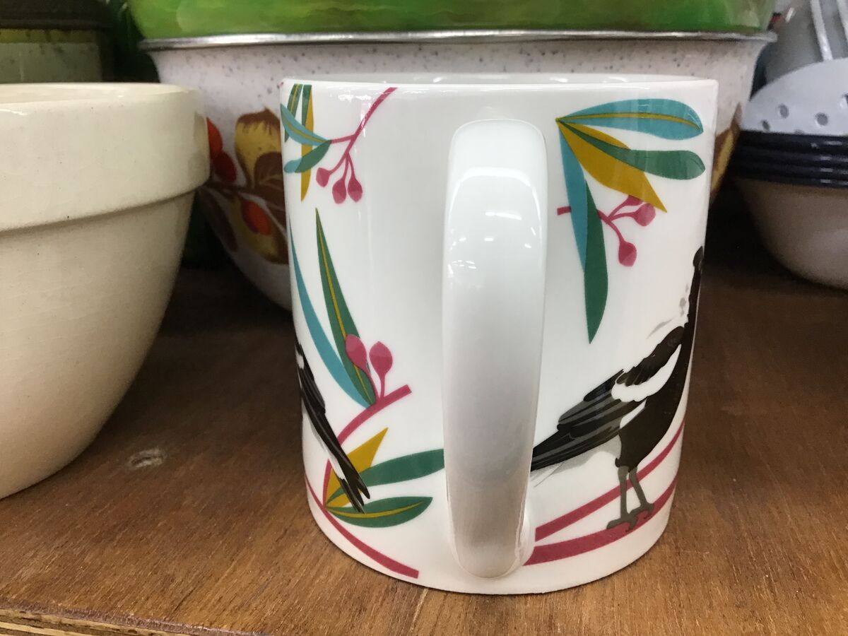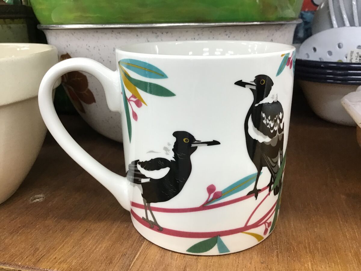 Magpie & Gum Leaves ceramic mug. It holds a proper cuppa, feels good in the hand, and cleans up easily.