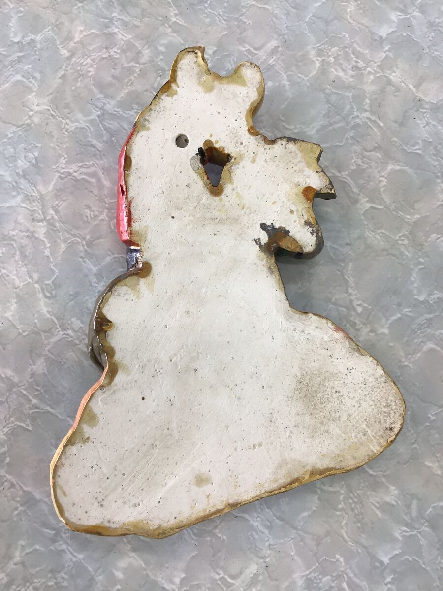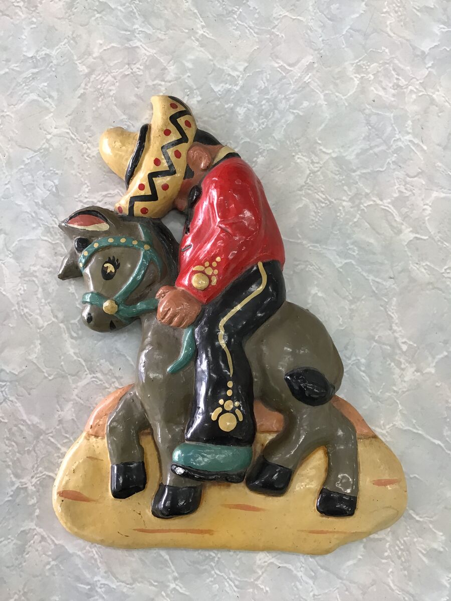 Vintage chalk ware wall plaque featuring a Mexican man riding a donkey.