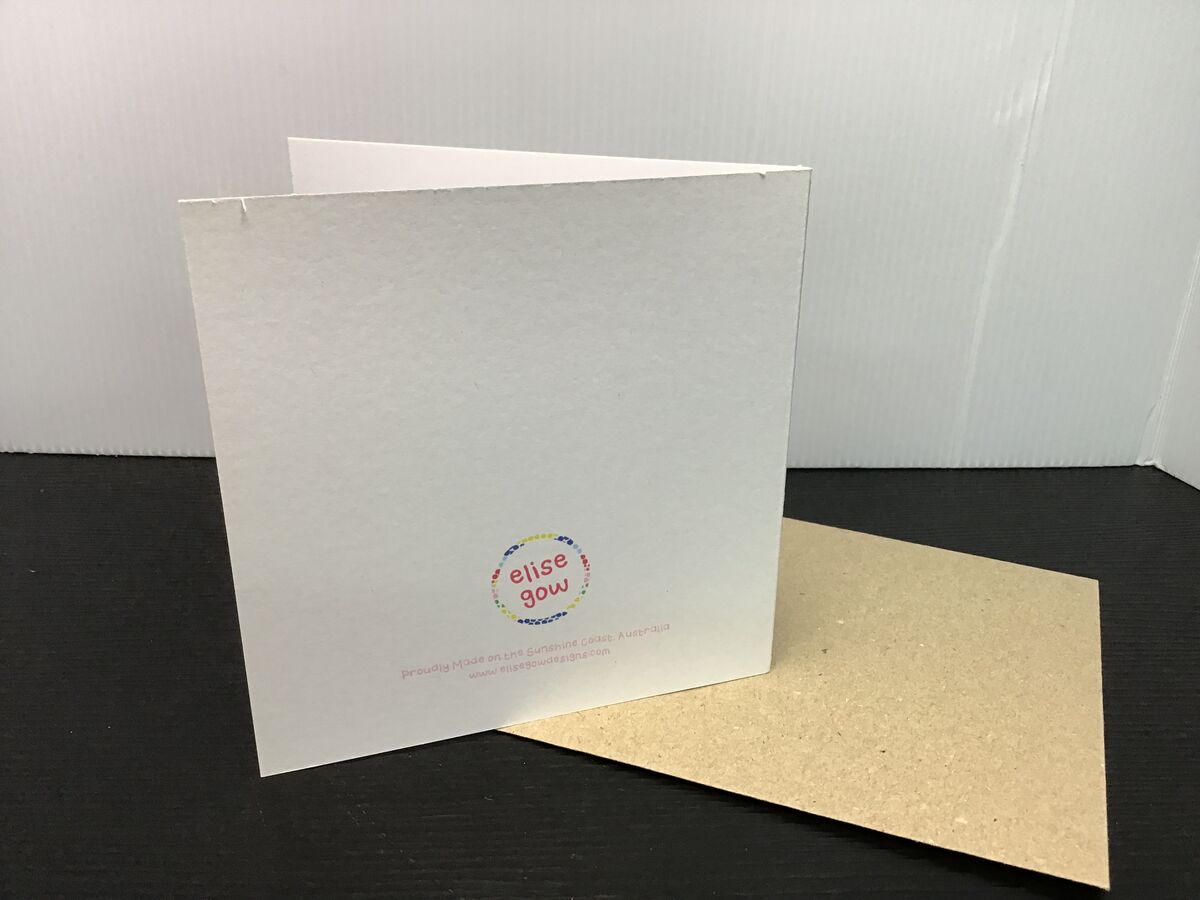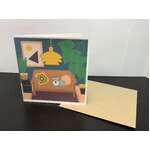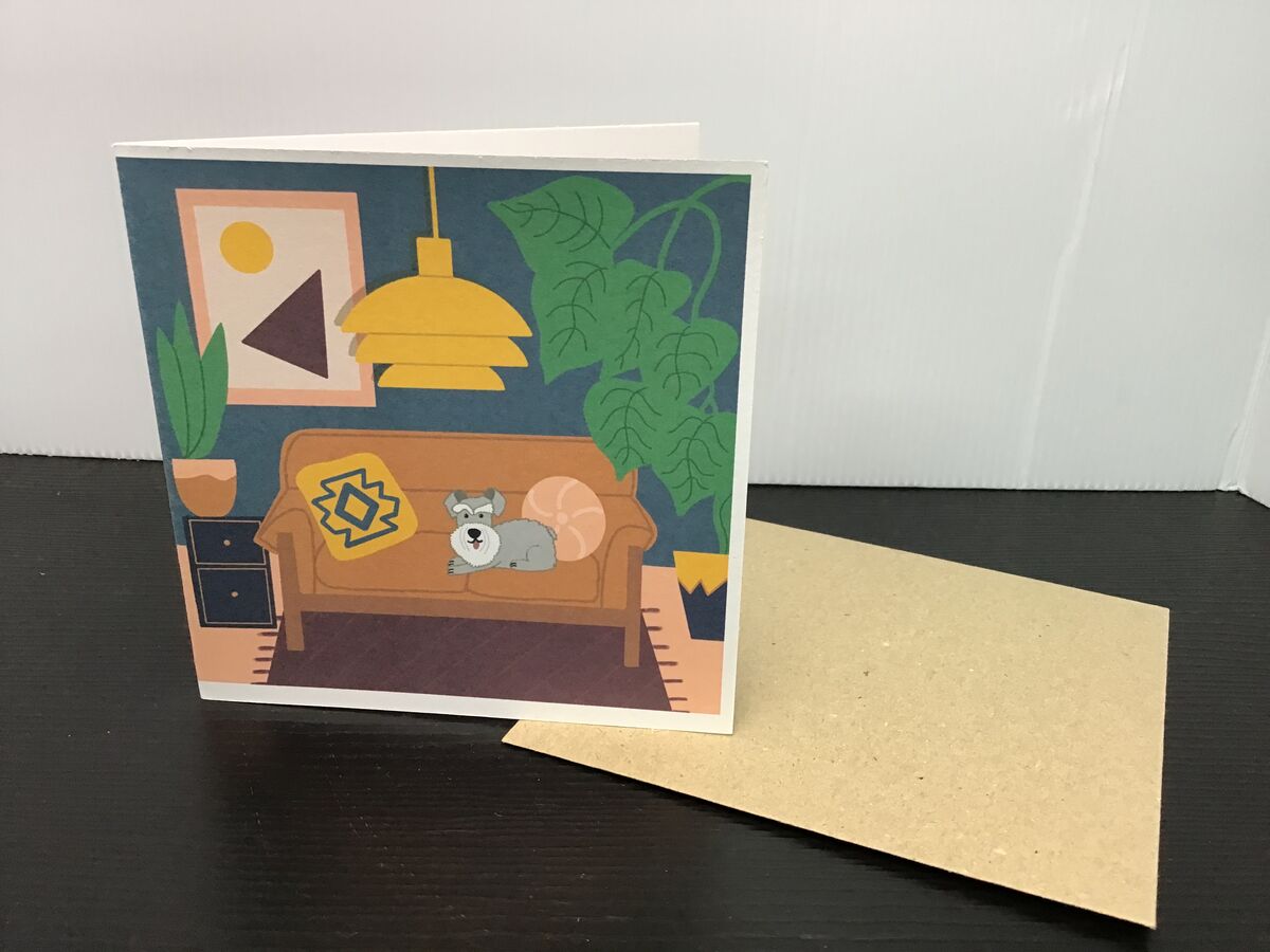 Blank greeting card by Australian artist Elise Gow featuring a grey schnauzer in a midcentury loungeroom: