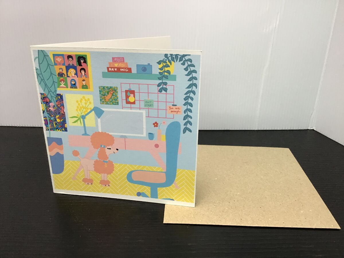 Blank greeting card by Australian artist Elise Gow featuring a pink poodle in a midcentury loungeroom:
