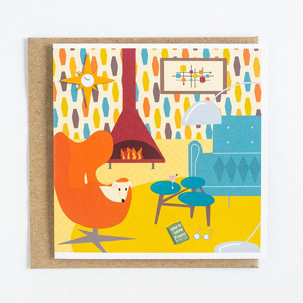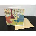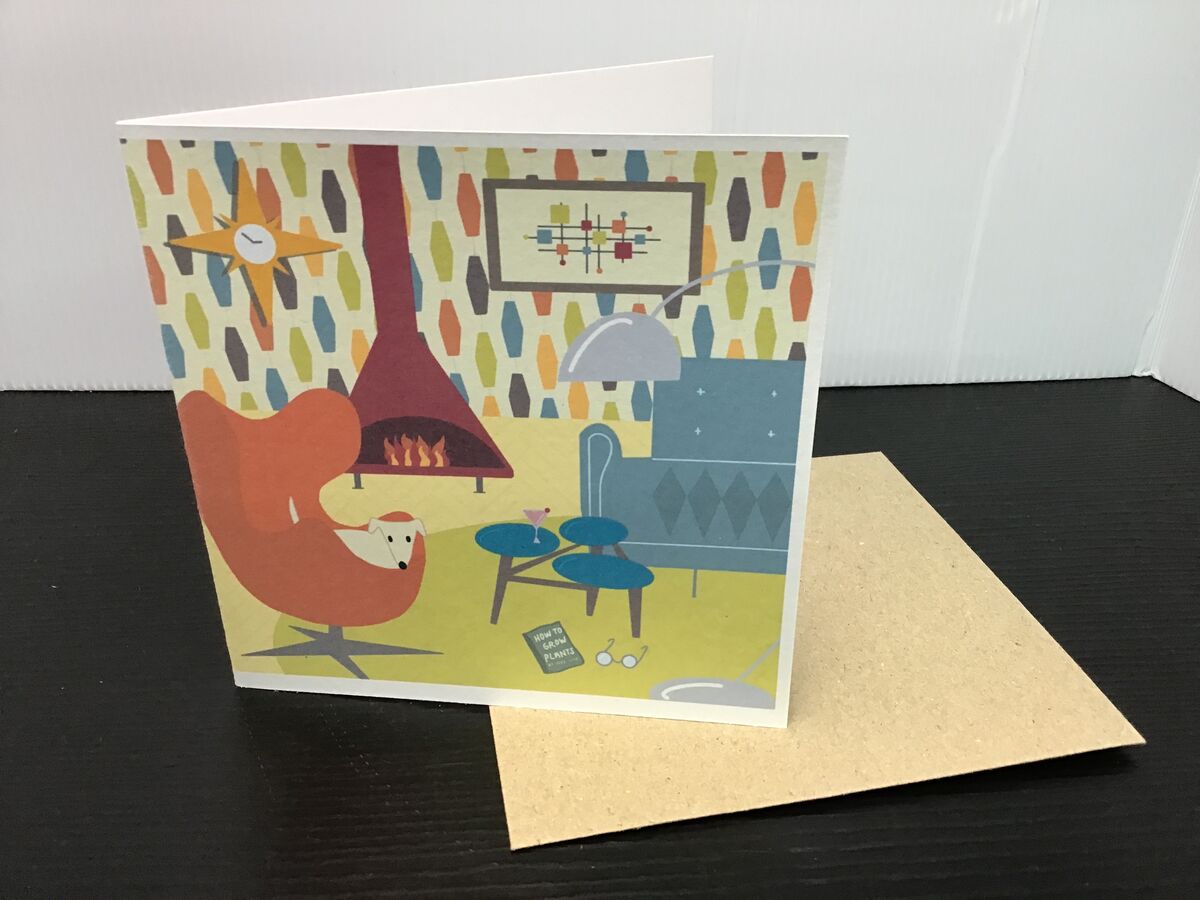 Blank greeting card by Australian artist Elise Gow featuring a white whippet in a midcentury loungeroom: