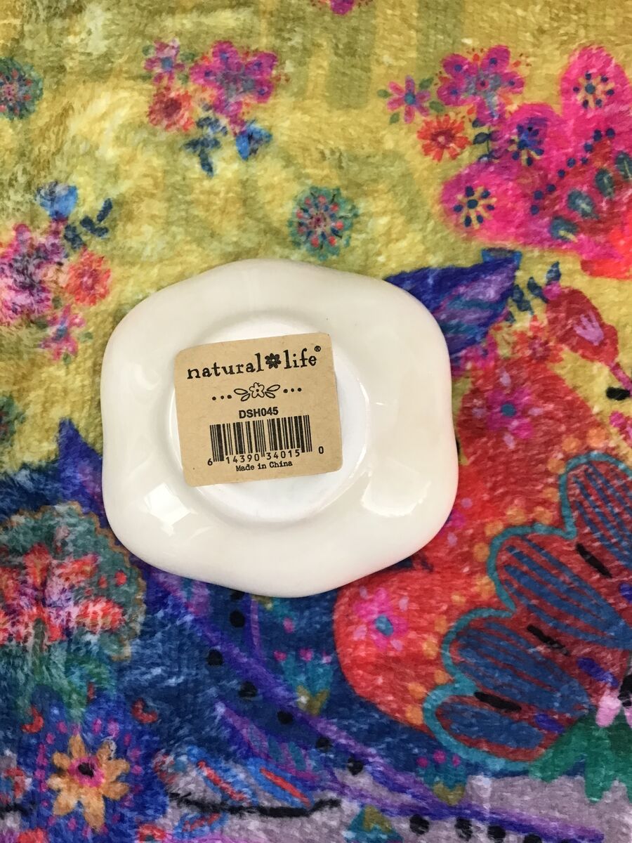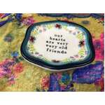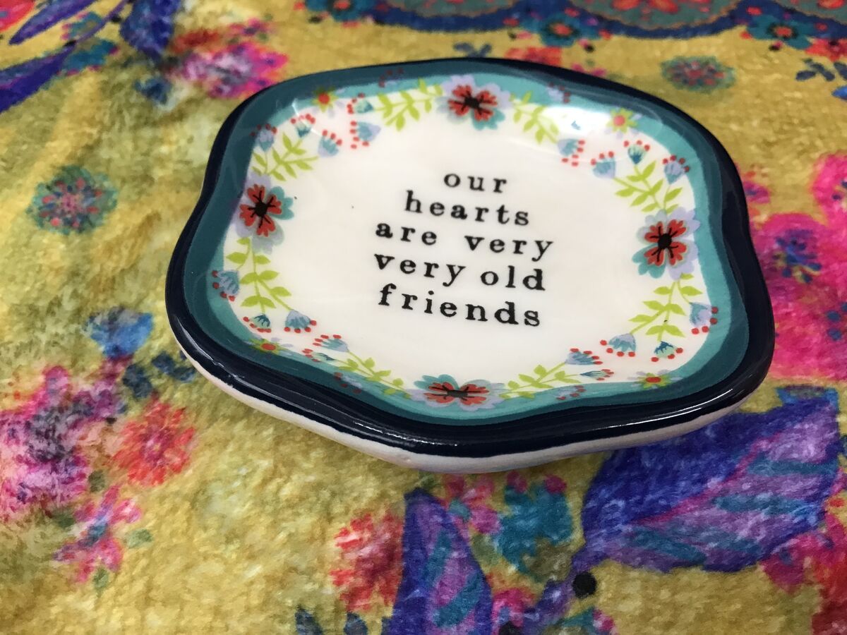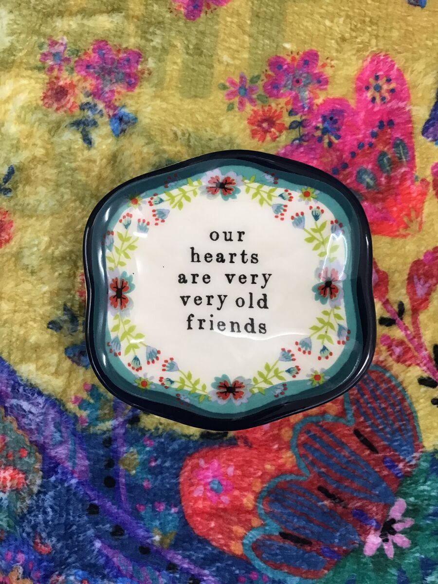 Small ceramic trinket dish with pretty floral border, and the words 'our hearts are very very old friends' across the center in old style typography.