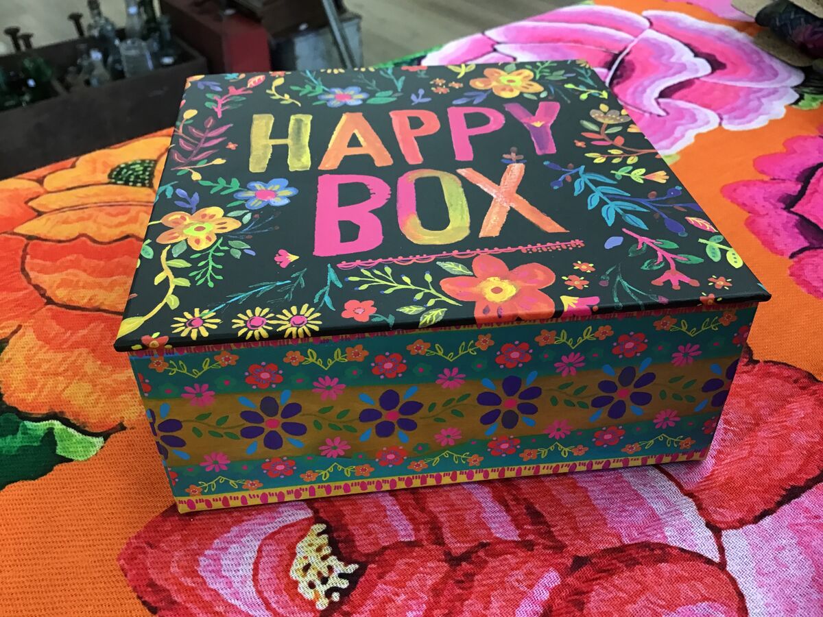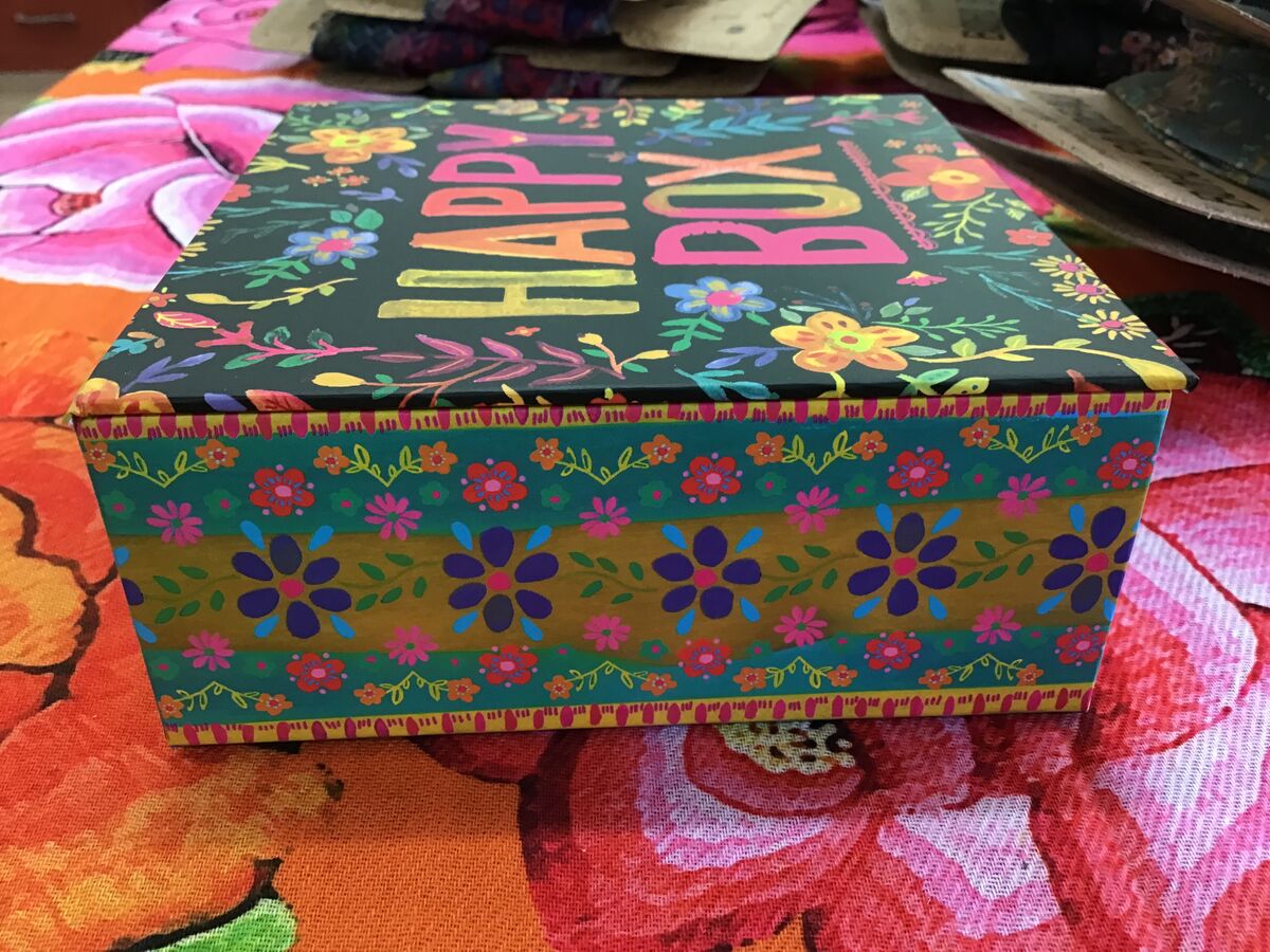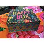 Colourful 'Happy Box' to store special bits and pieces. Made from heavy duty cardboard with a flip style top lid.