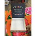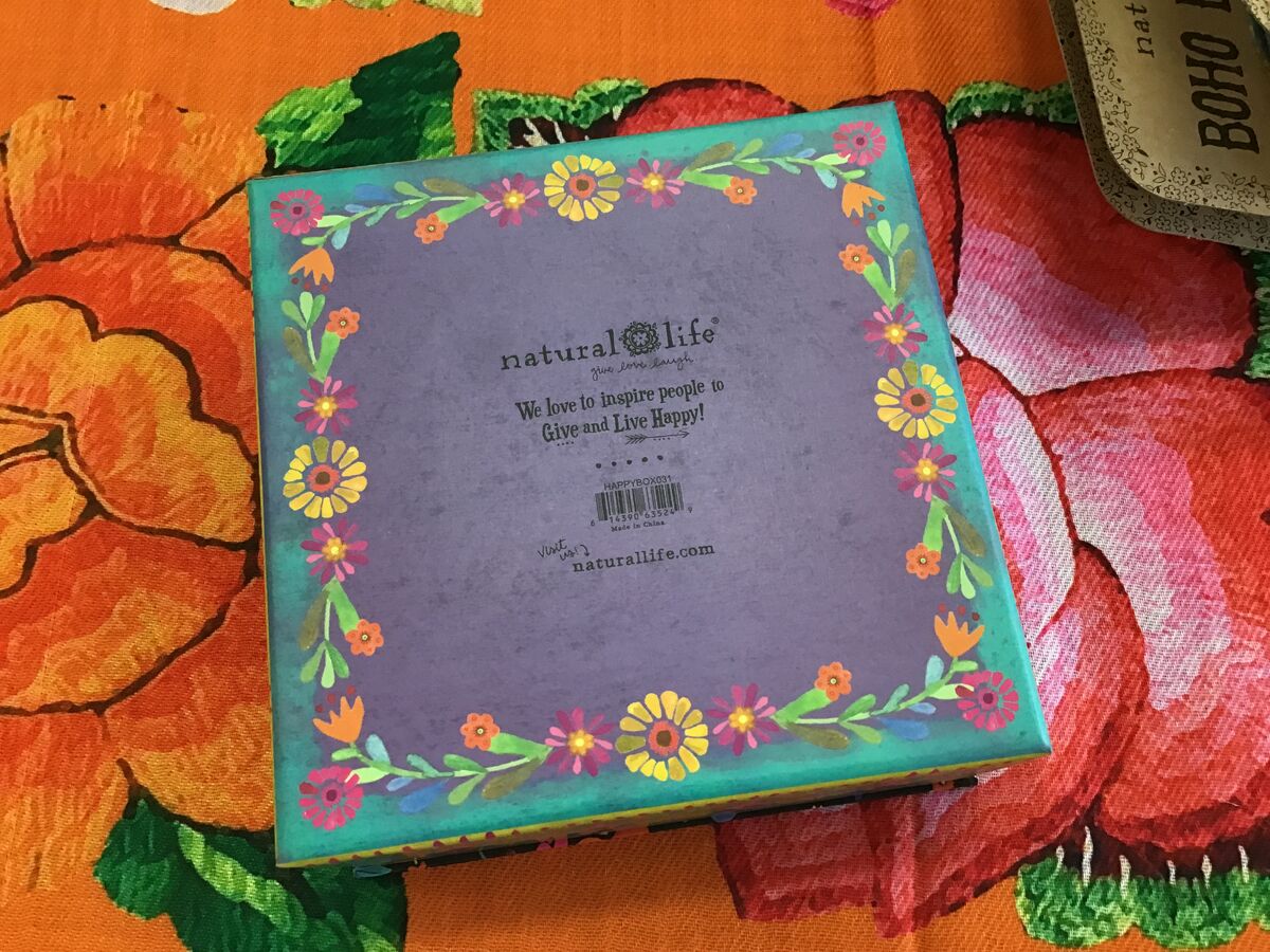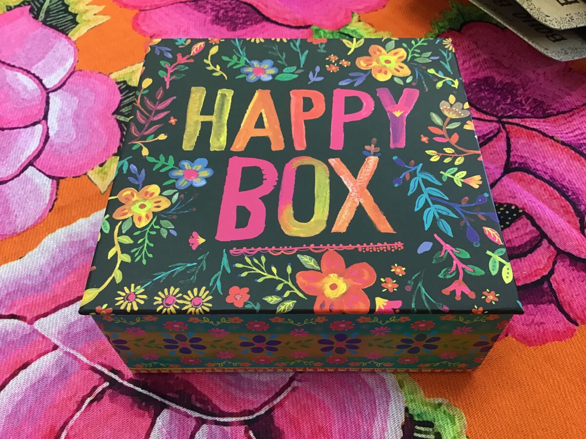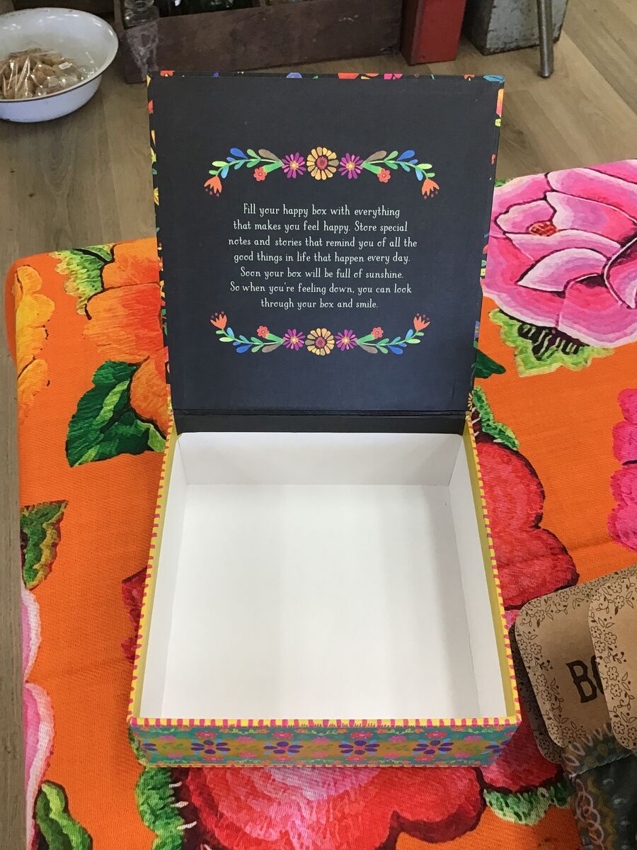 The inside of the lid says 'Fill your happy box with everything that makes you feel happy. Store special notes and stories that remind you of all the good things in life that happen every day. Soon your box will be full of sunshine. So when you're feeling down, you can look through your box and smile'.