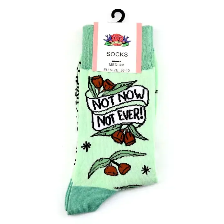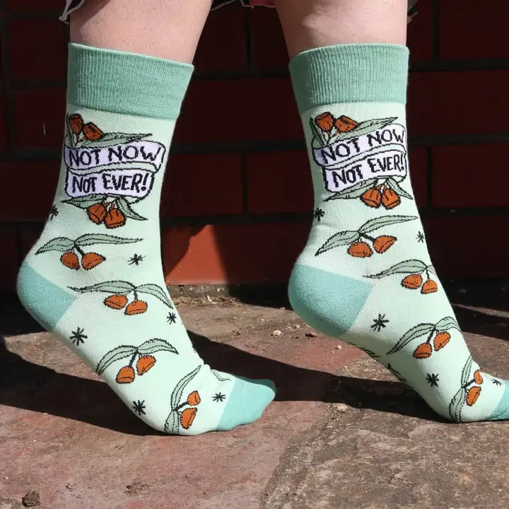 Jubly-Umph 'Not Now Not Ever' socks. For people who are absolutely done with everyone else's nonsense (particularly misogynists) and want their feet to say it louder than their mouth.