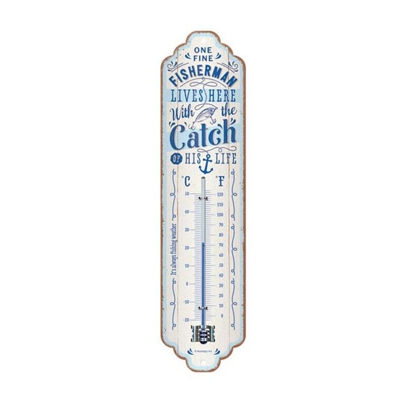 Vintage style tin plate thermometer 'One fine fisherman and the catch of his life lives here'.