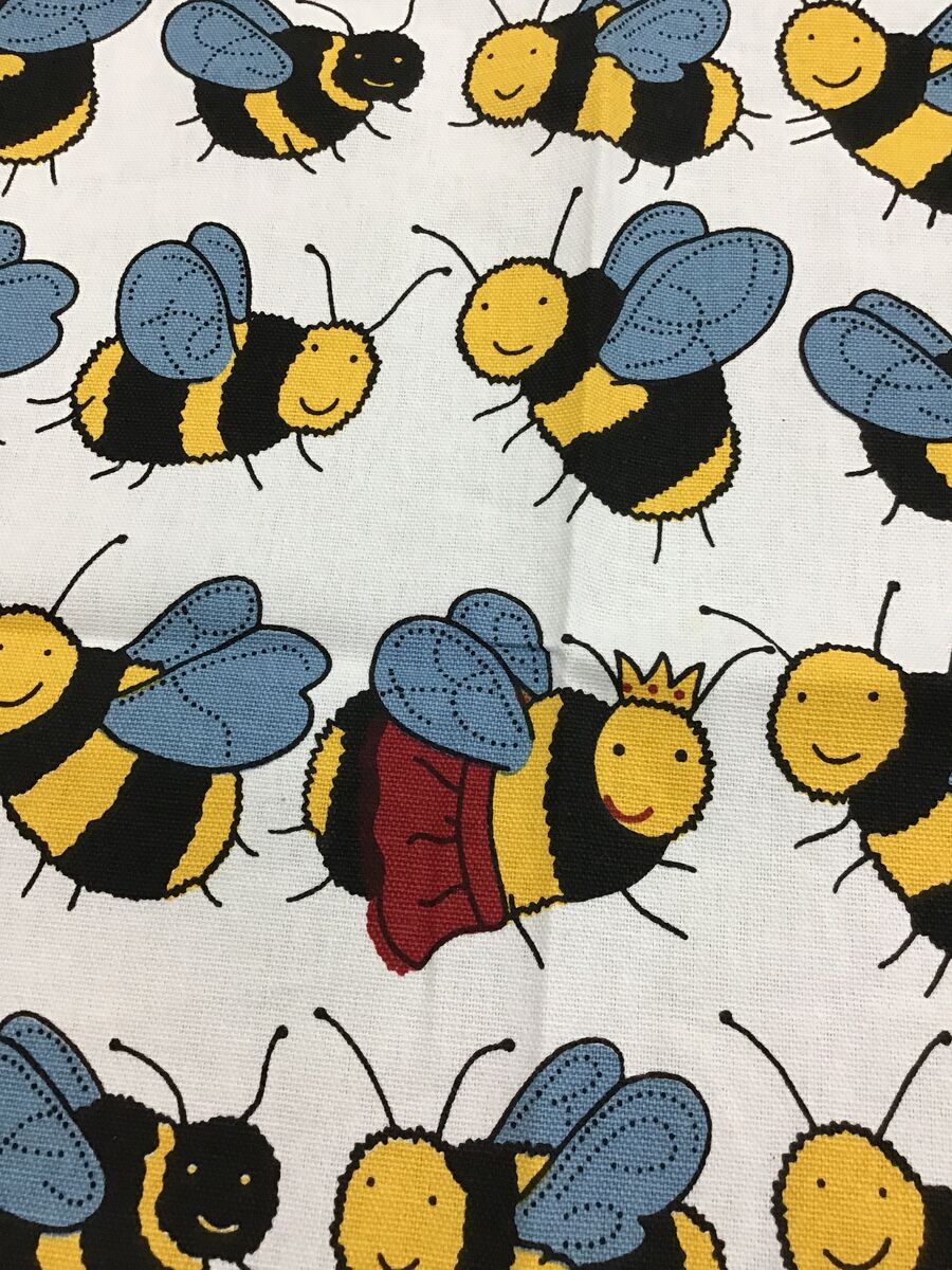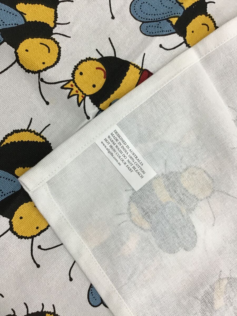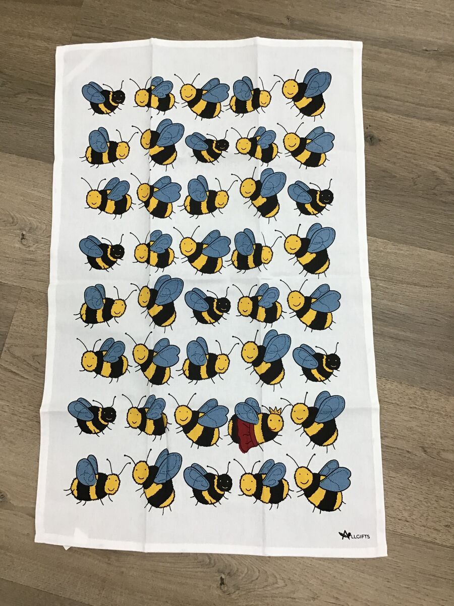 This playful tea towel features a grid of cheerful cartoon bees, each with bright stripes and fluttering wings - and one hardworking Queen bee amongst the swarm wearing her red cape and crown.