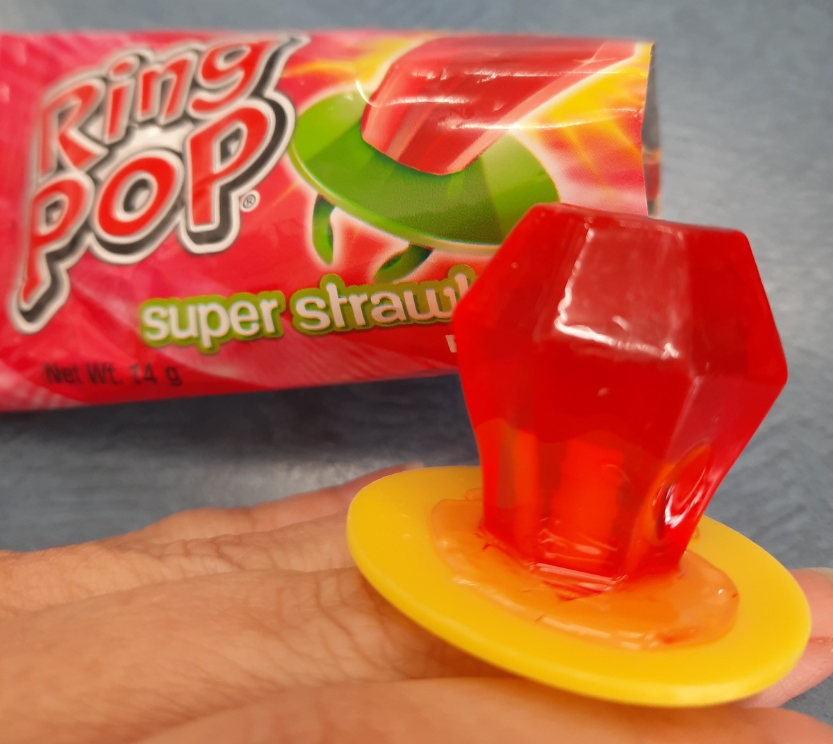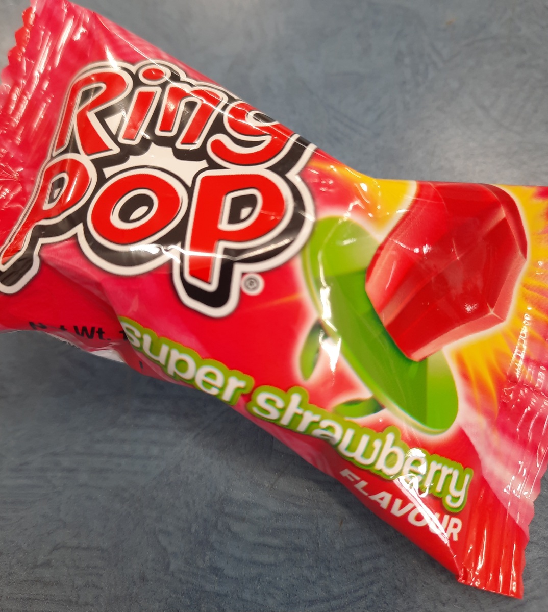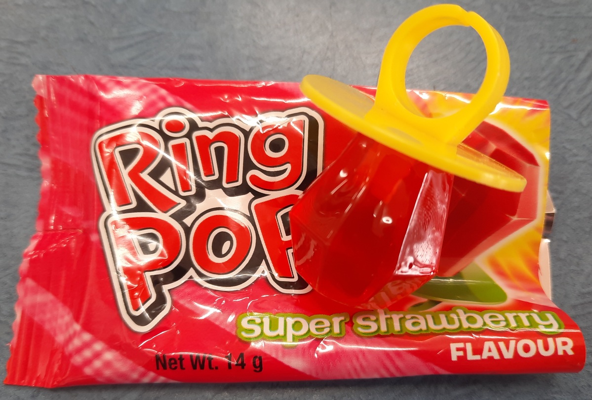 Super Strawberry-flavoured Ring Pop, guaranteed to bring back your childhood memories! A staple amongst party treats and deli delectables since the late 1970s. Often worn as a makeshift engagement ring when playing dress-ups but eaten before the ceremony could be completed.