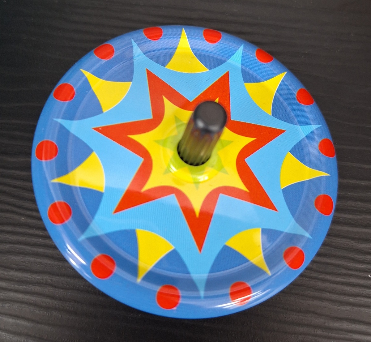 This fun and playful metal and plastic patterned spinning top is a fun and simple way to entertain and educate.