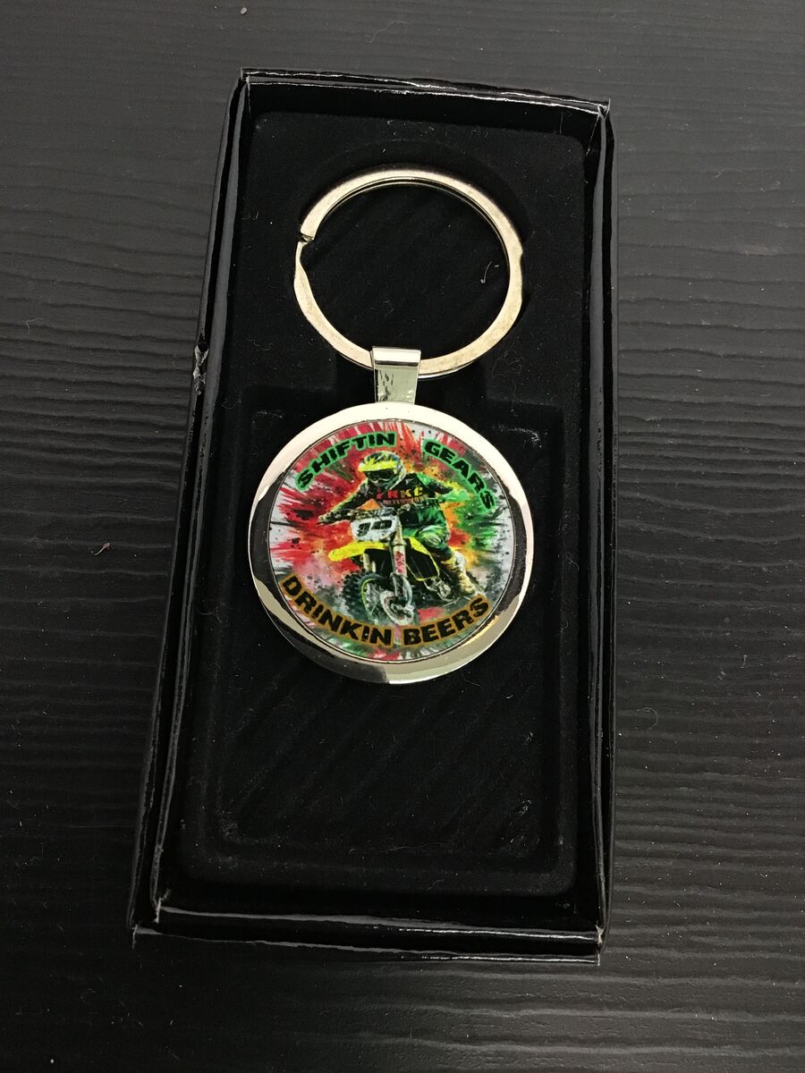 Dirt bike themed keyring - 'Drinkin Beers, Shifting Gears'.