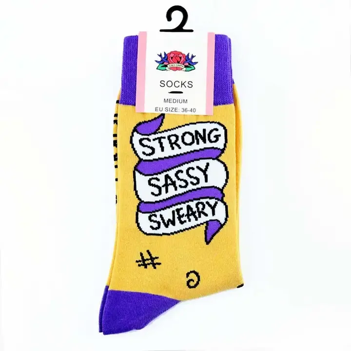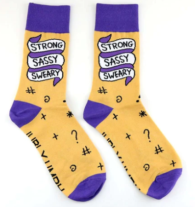 Jubly-Umph 'Strong Sassy Sweary' socks. For loud, proud legends who lift heavy things, crack sharp jokes and sprinkle f bombs like confetti.