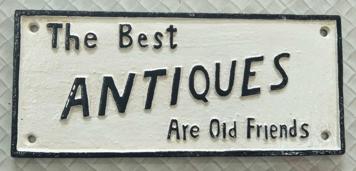 Rectagular cast iron sign - 'The Best Antiques Are Old Friends', because people are better than stuff...well some of them...and contingent on what the stuff is.