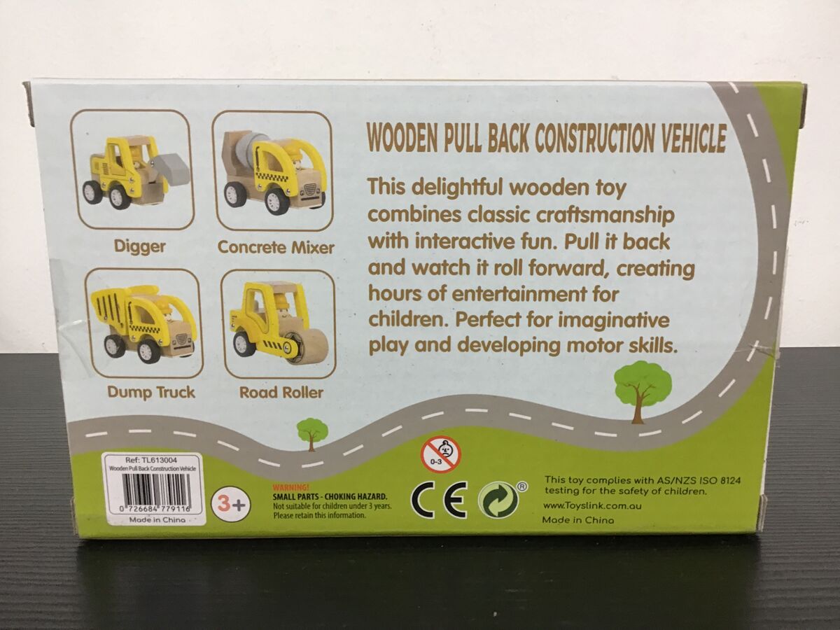 This ToysLink wooden pull back digger is built for busy job sites. Pull it back, let go, and it zooms forward by itself. The chunky wooden design is easy for small hands to grip, and it is perfect for imaginative play while building coordination and fine motor skills. For ages 3+.