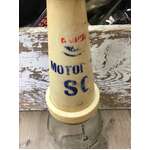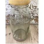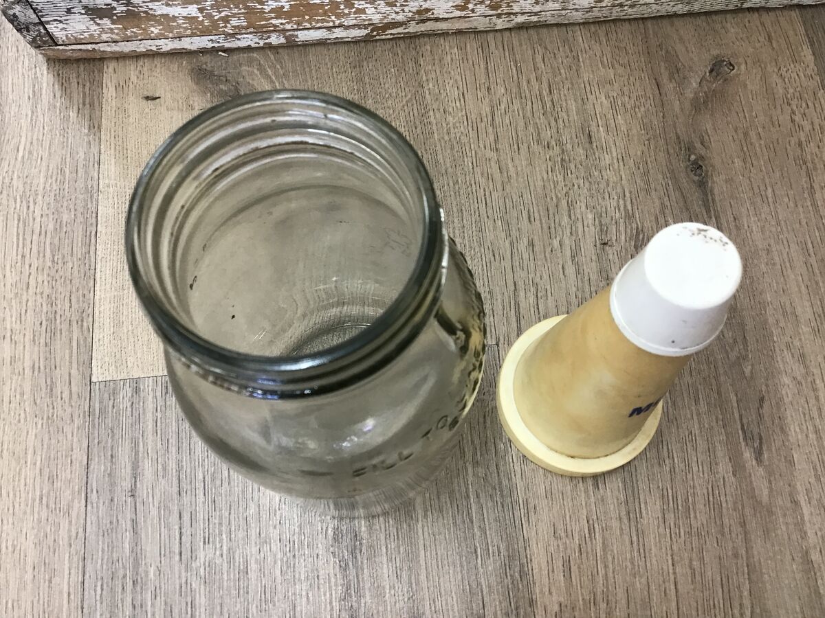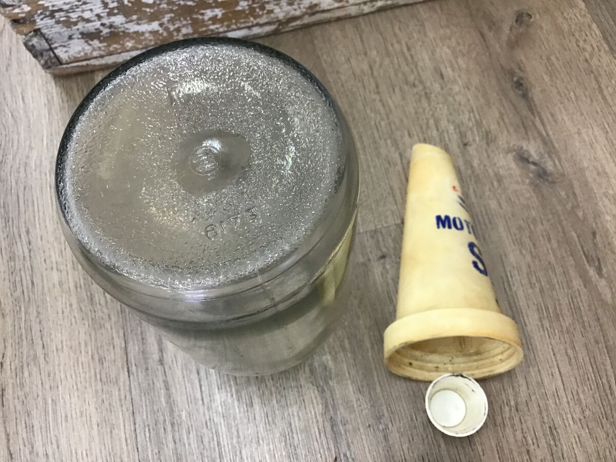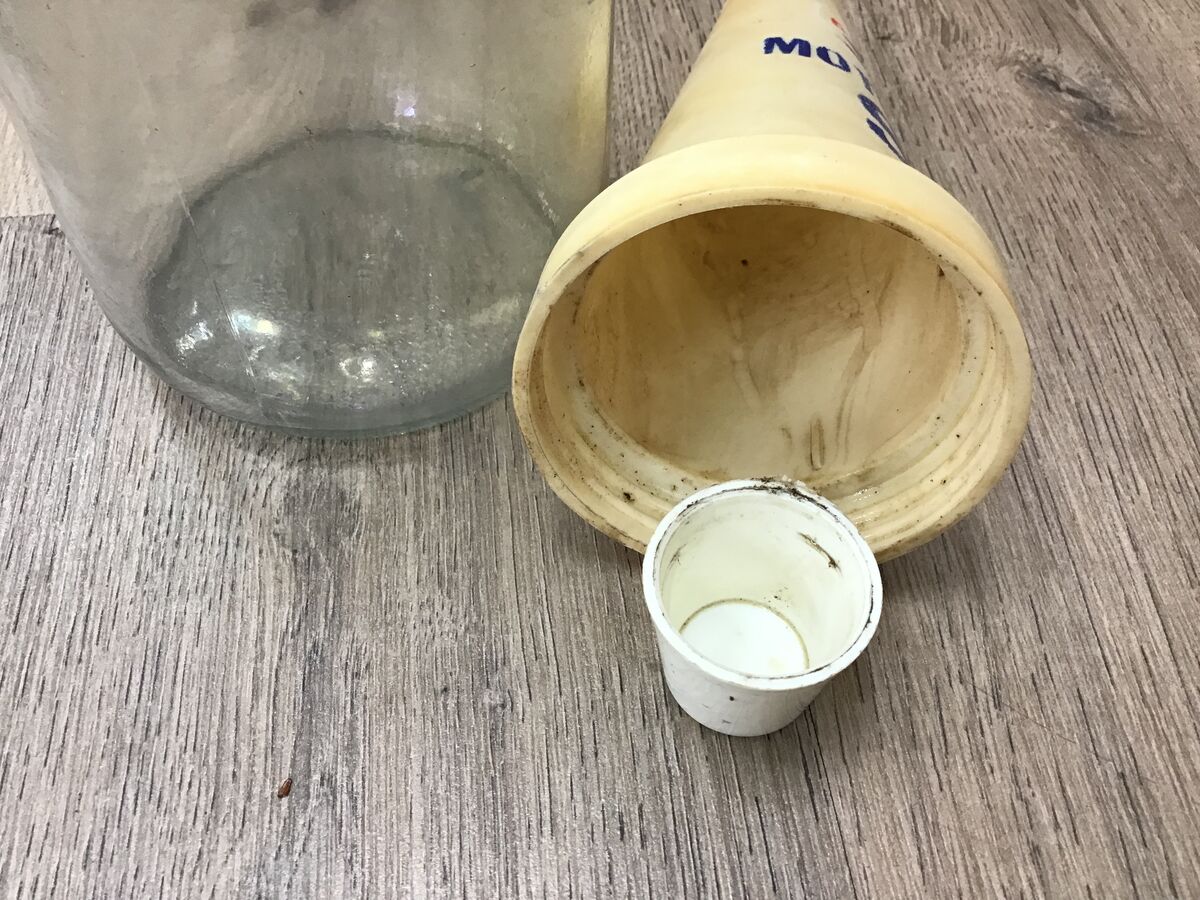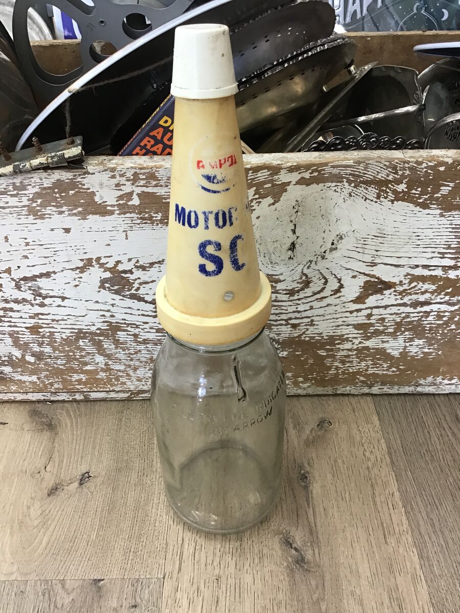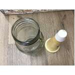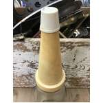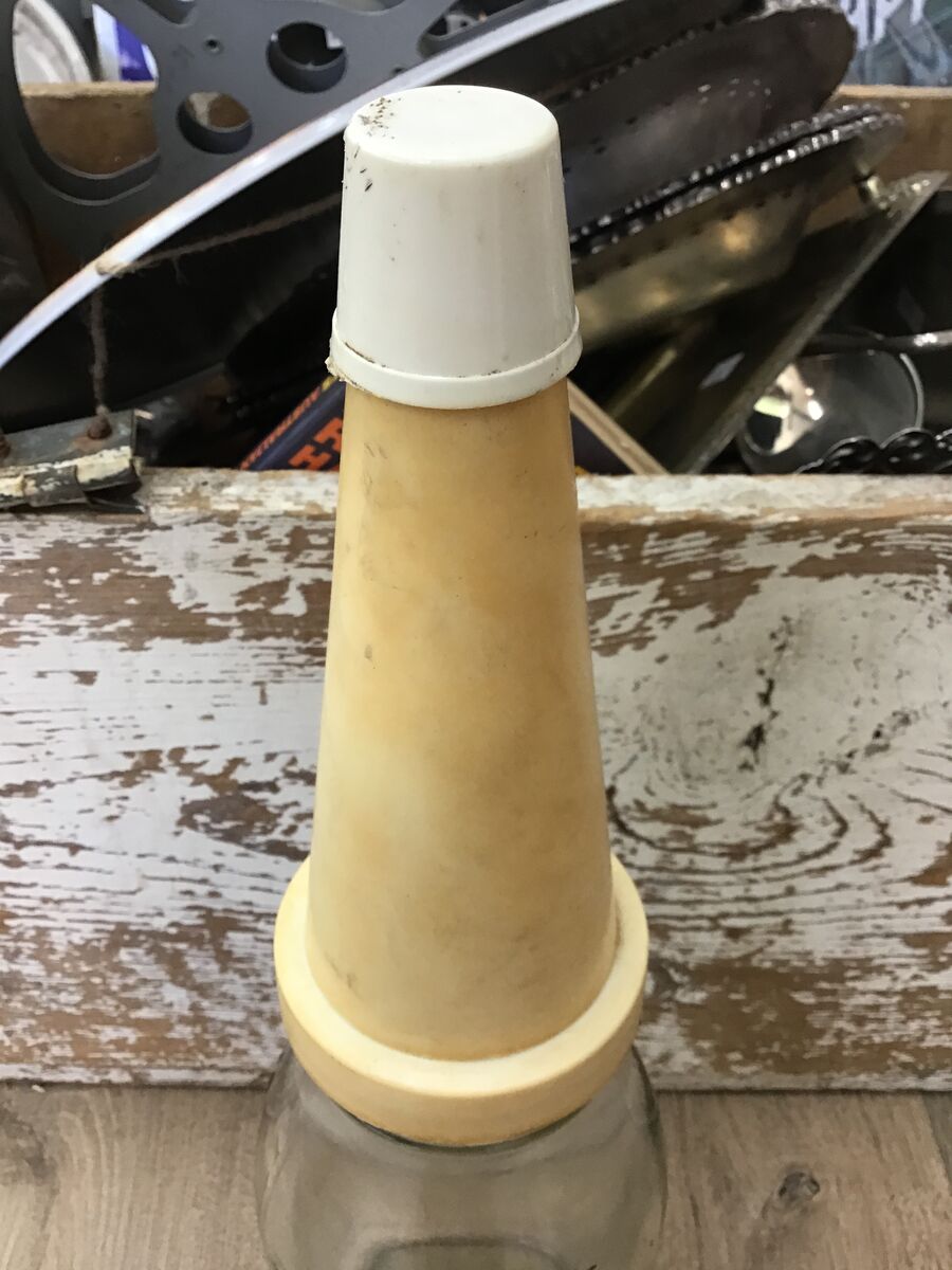 Vintage 1 Litre glass oil bottle with white plastic pourer and dust cap: